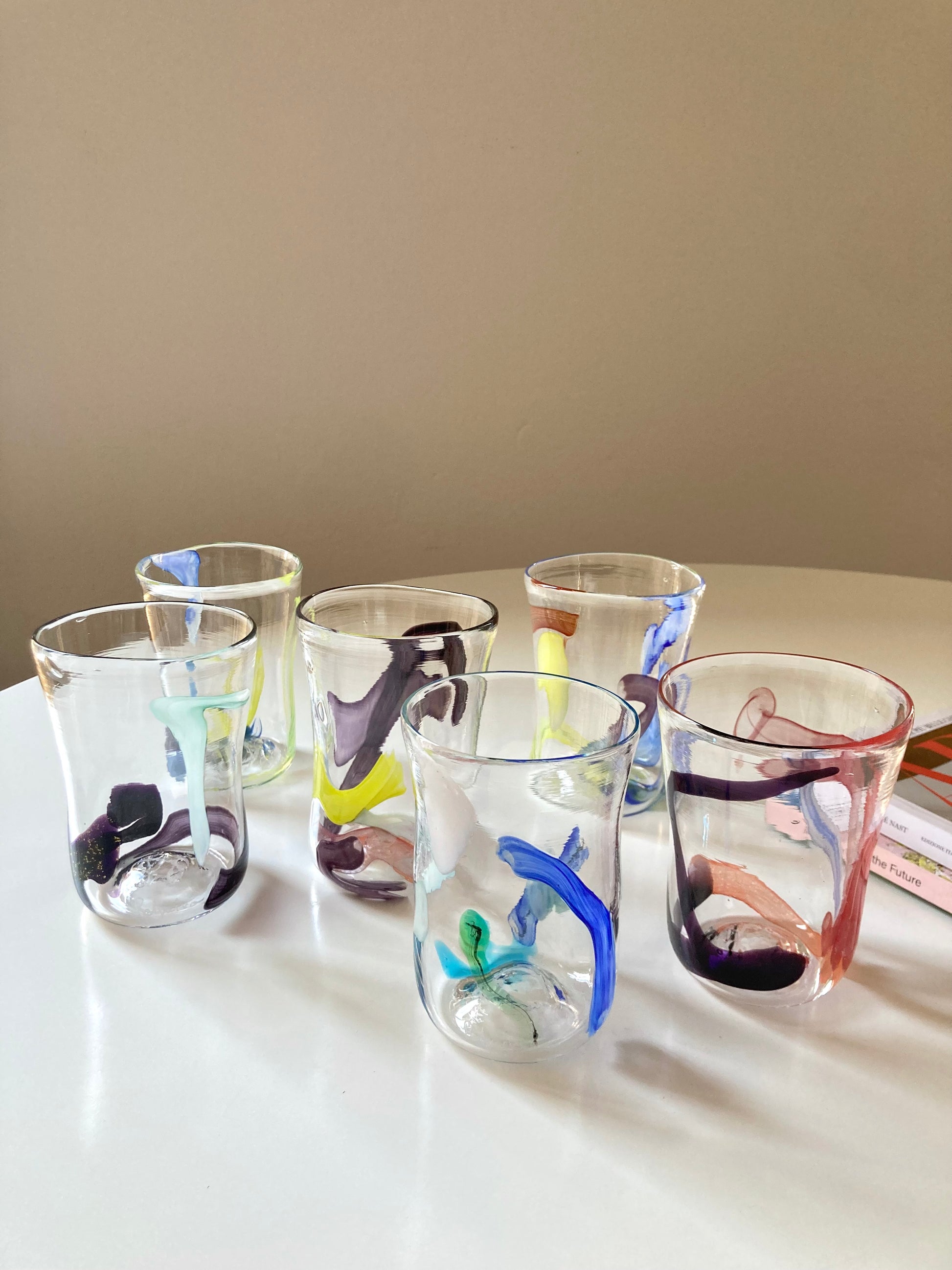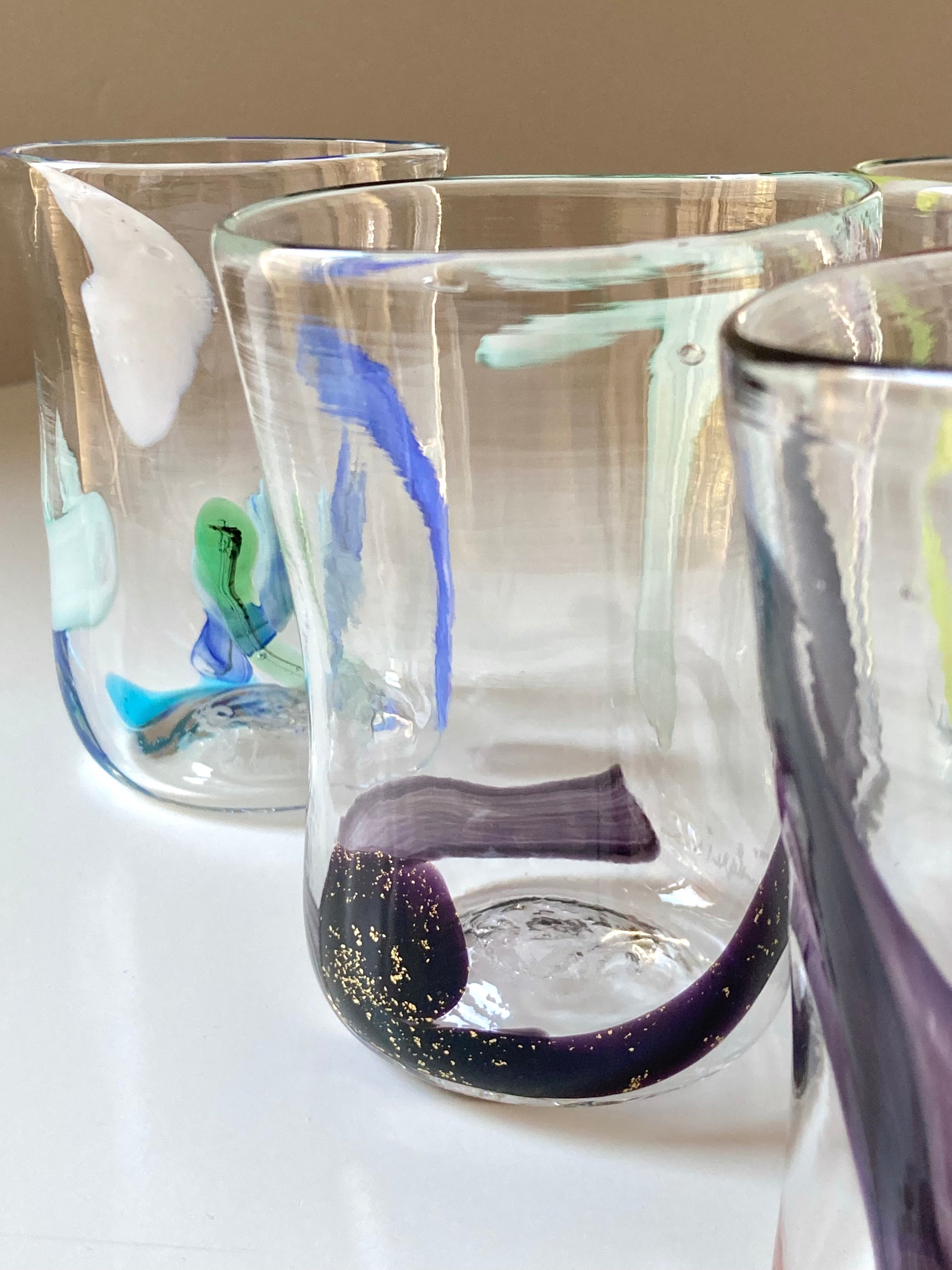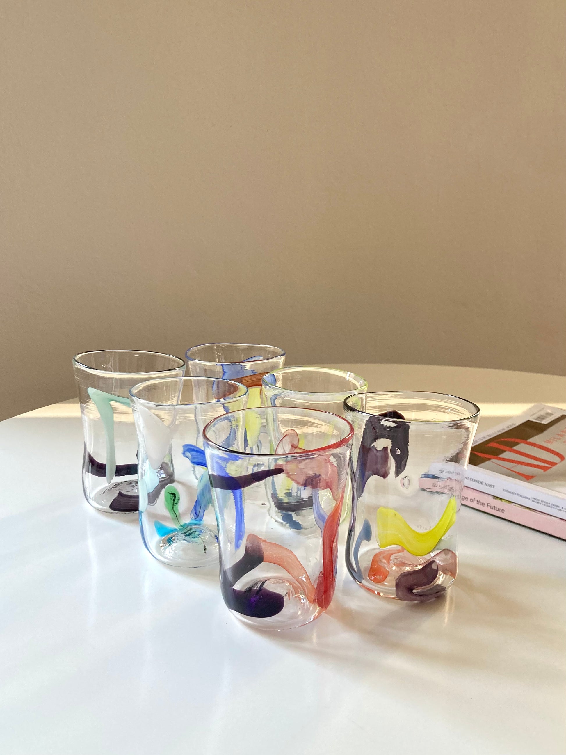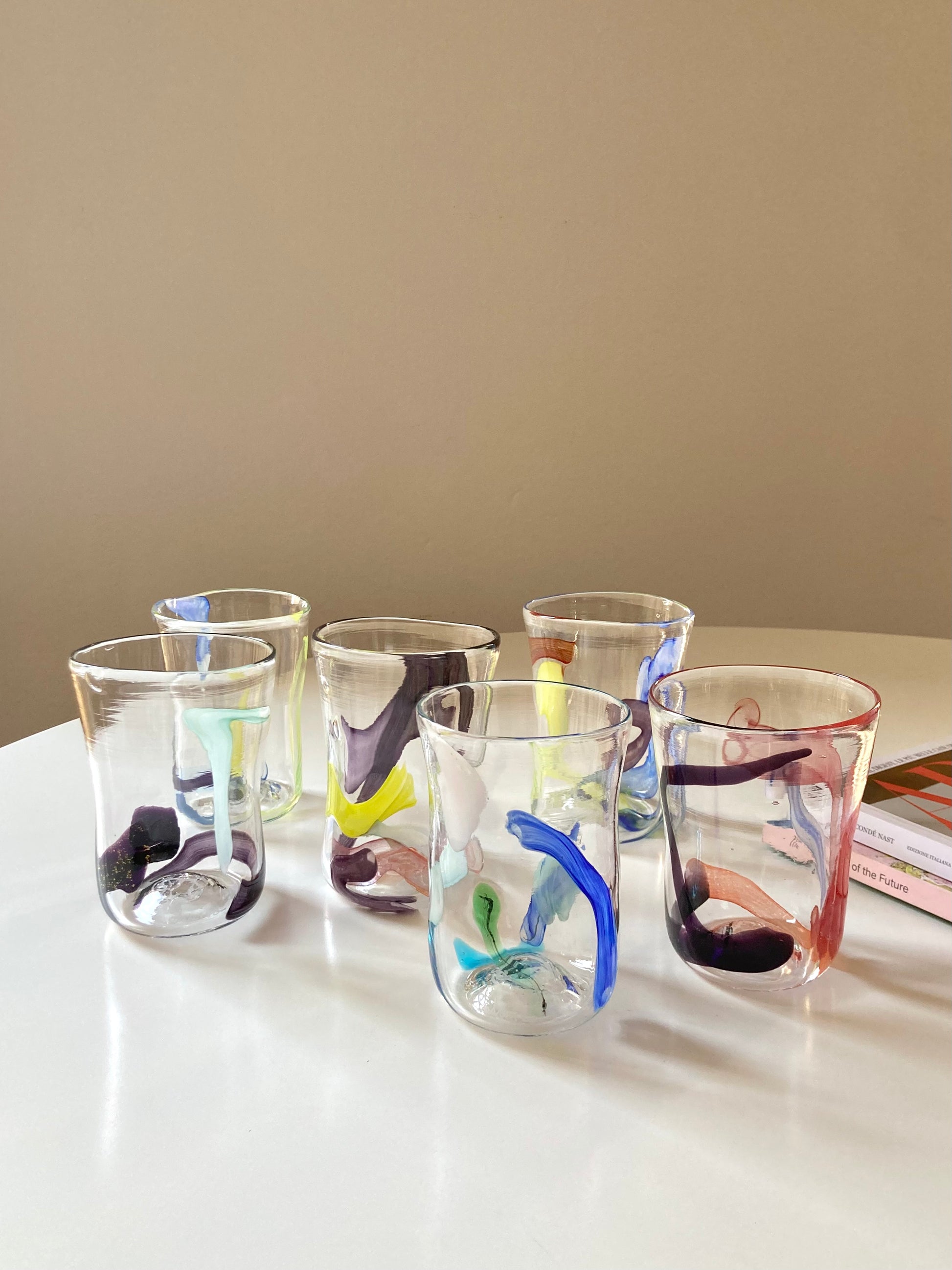 Set di 6 bicchieri goti veneziani da vino o acqua realizzati interamente a mano in vetro di Murano e decorati con linee e forme astratte che rendono ciascun bicchiere unico e diverso dagli altri 🎨