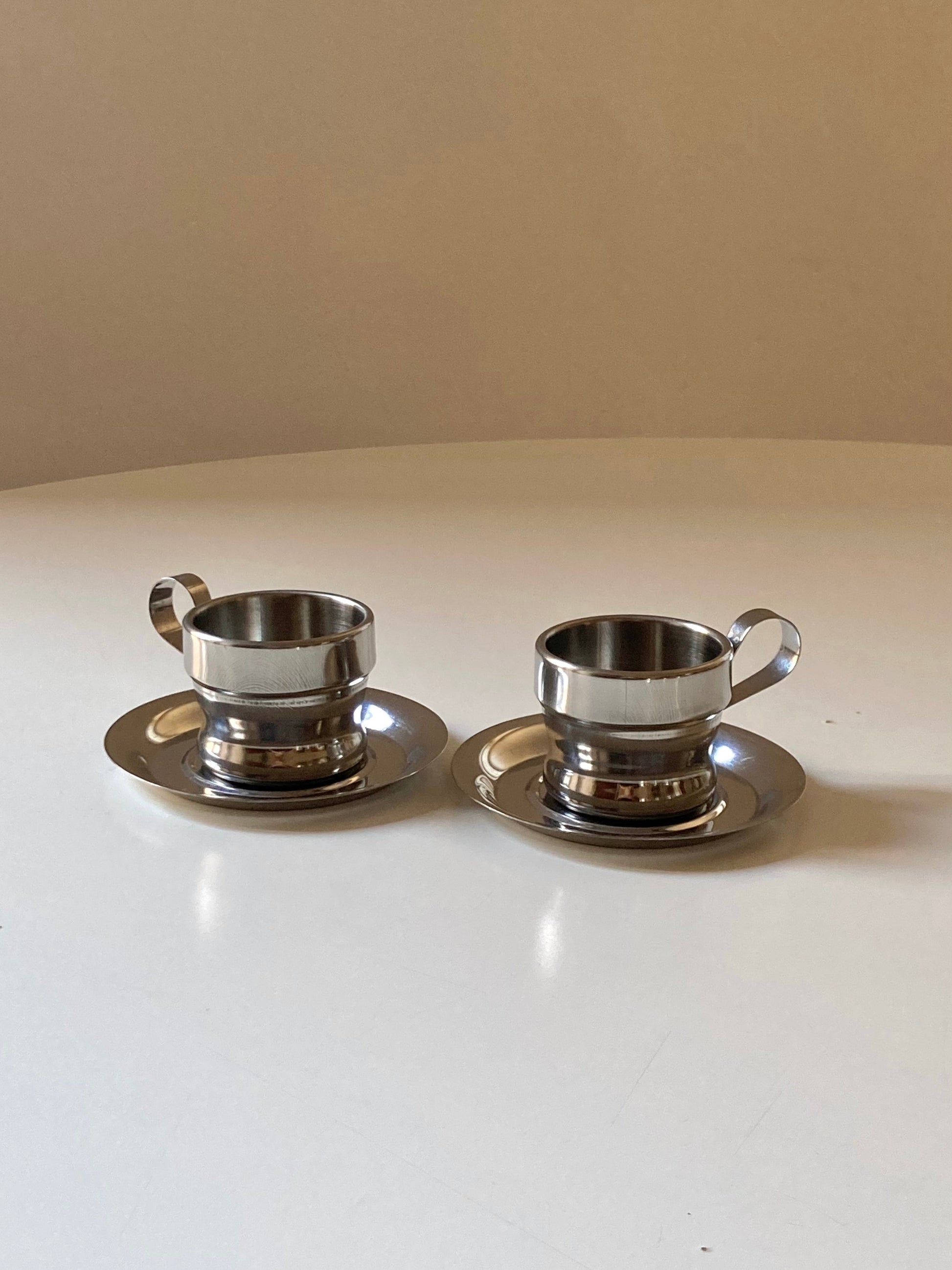 Coppia di due tazzine da caffè termiche in acciaio vintage anni ‘70 modello Jolly di Rivadossi con piattini inclusi 🩶🩶