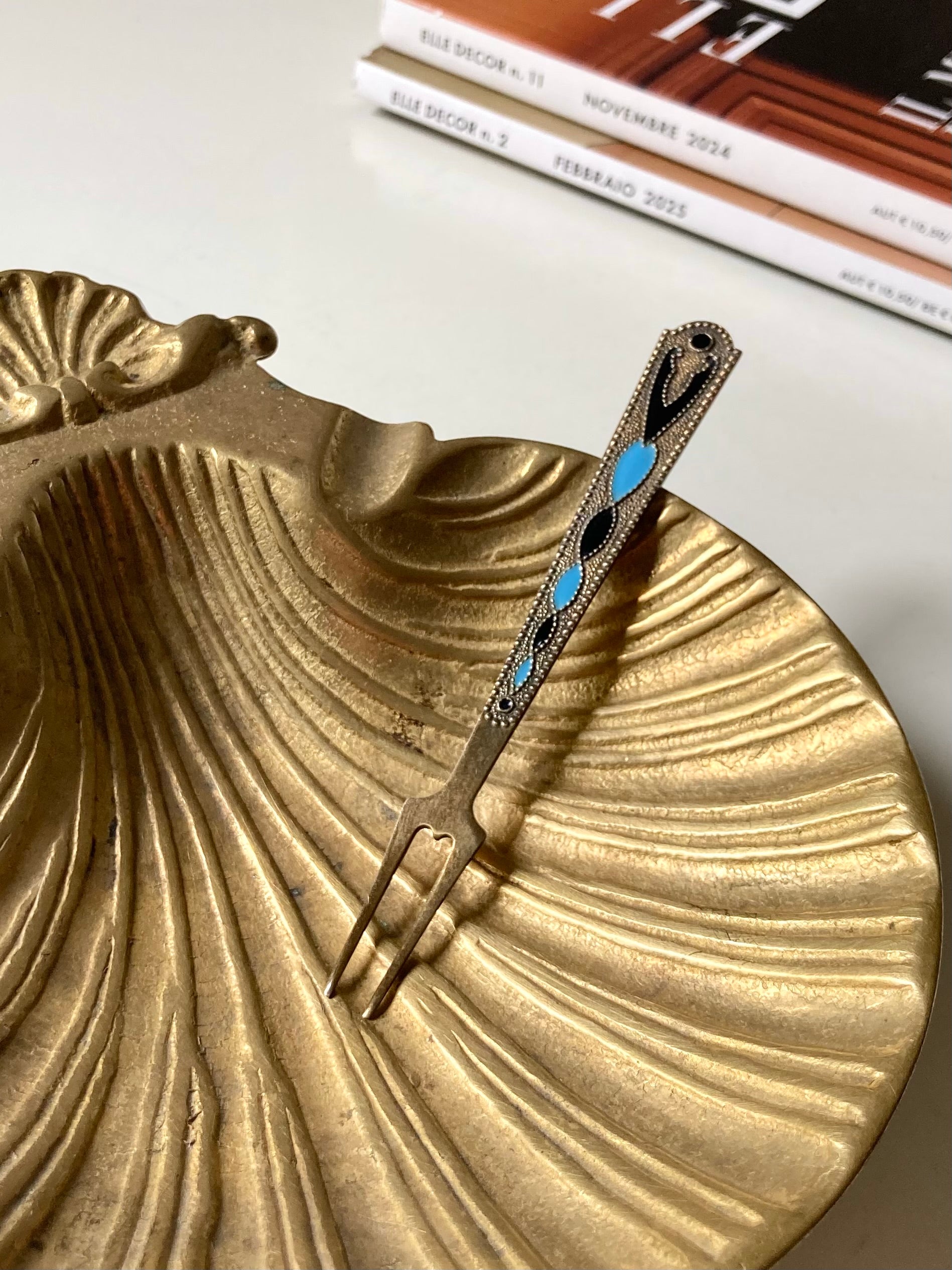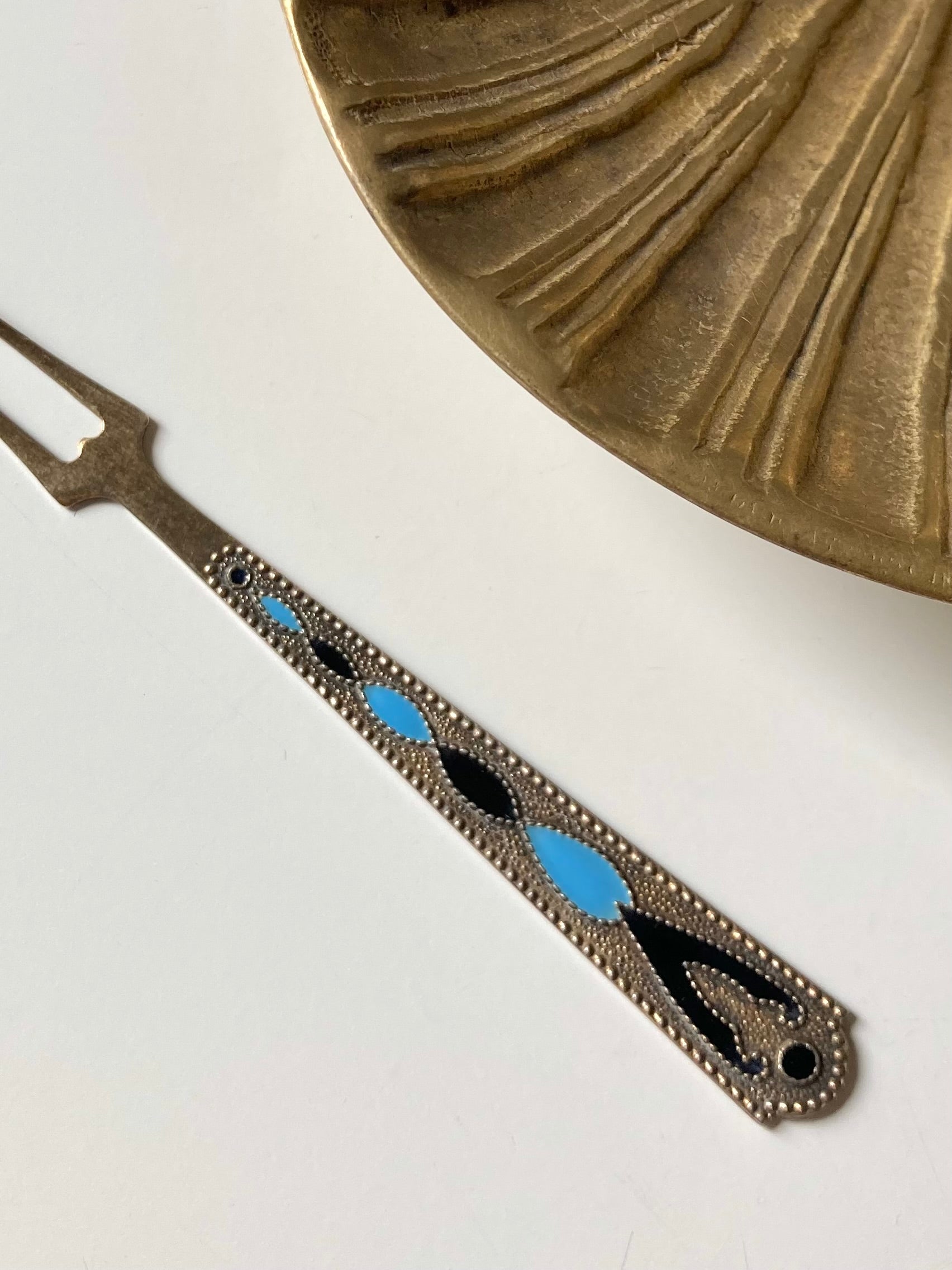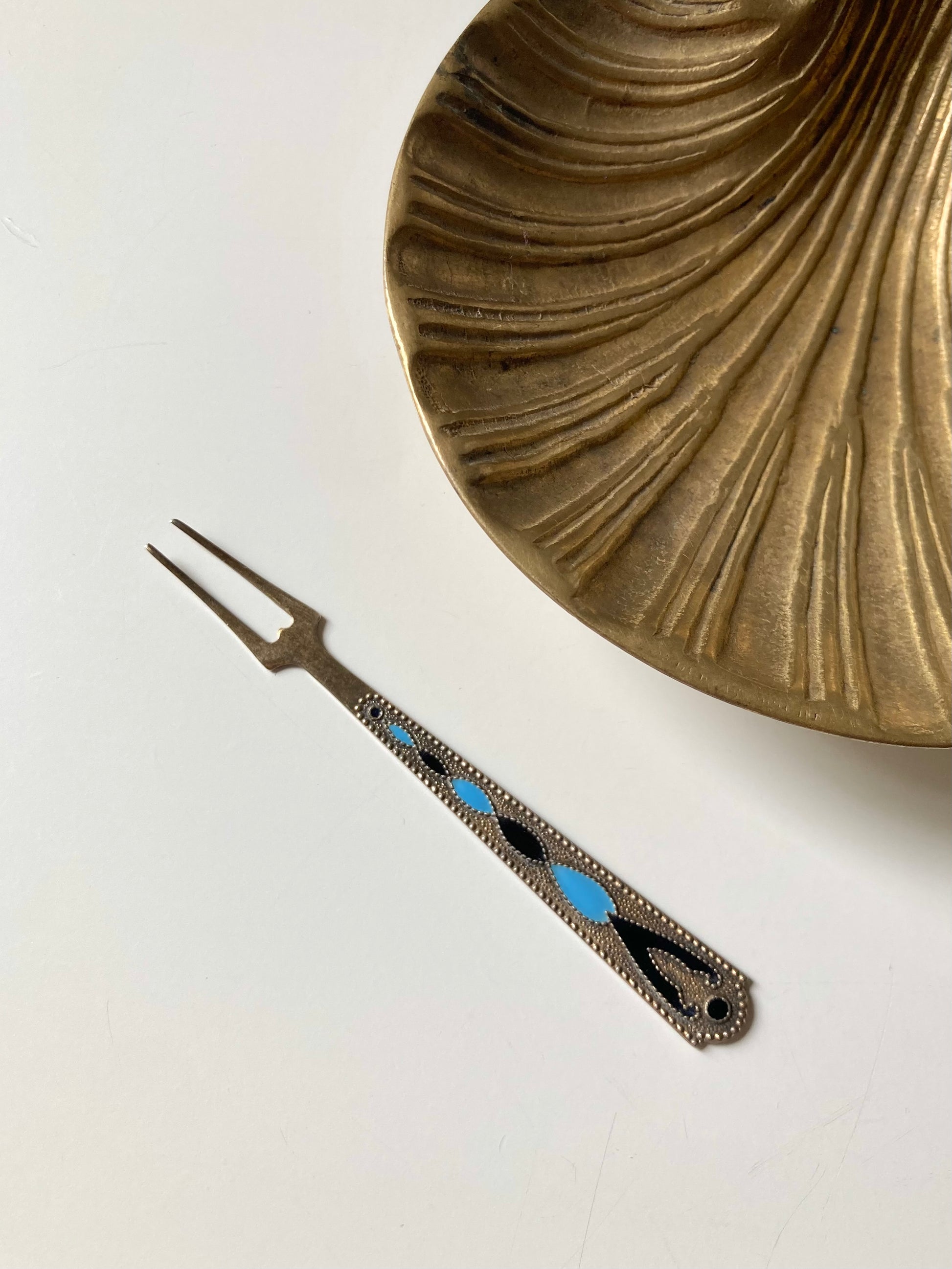 Forchettina da frutta vintage da collezione in argento 875 russo con decoro in rilievo colorato a smalto sul manico e simbolo di falce e martello URSS sul retro ⭐️