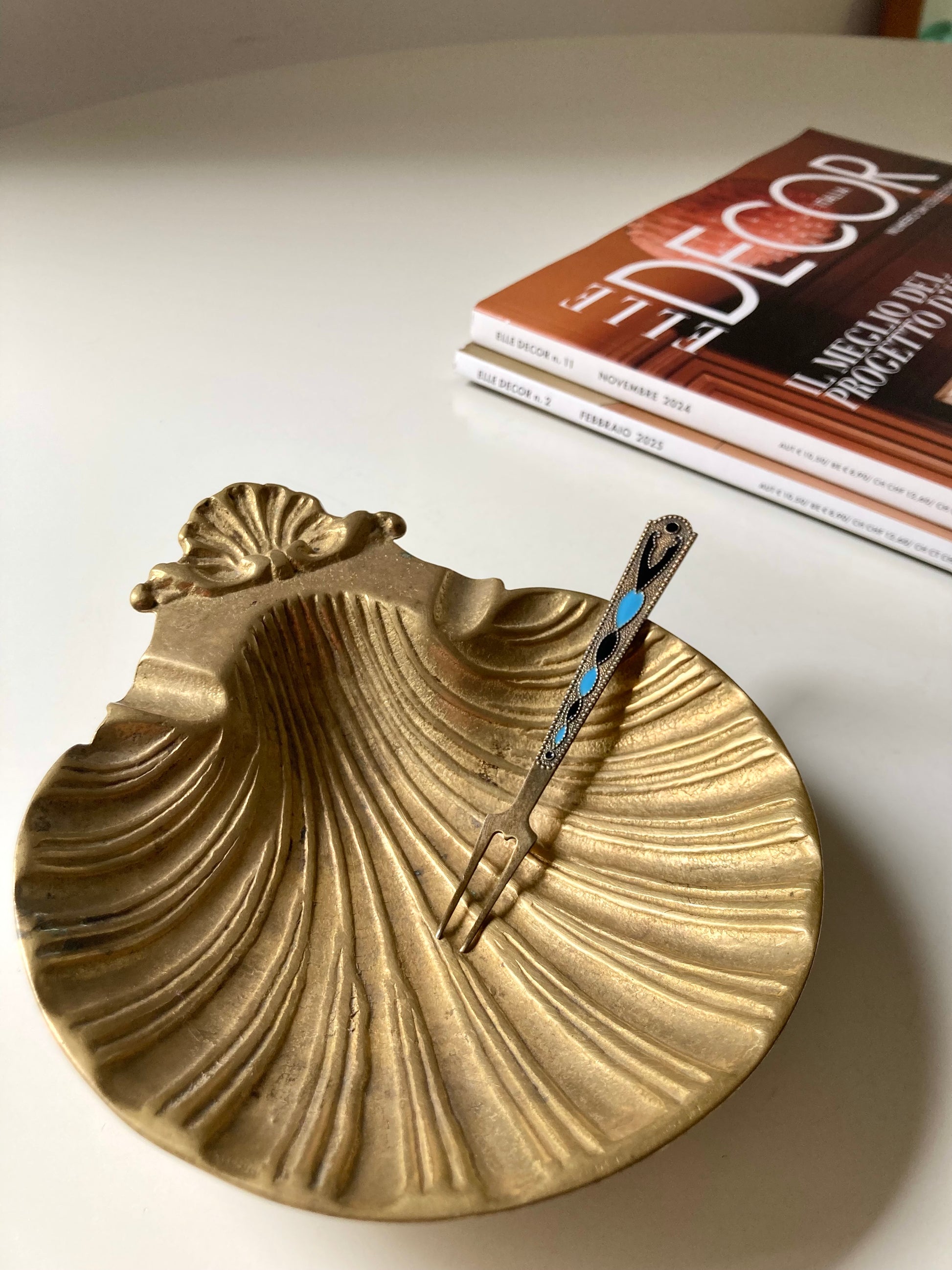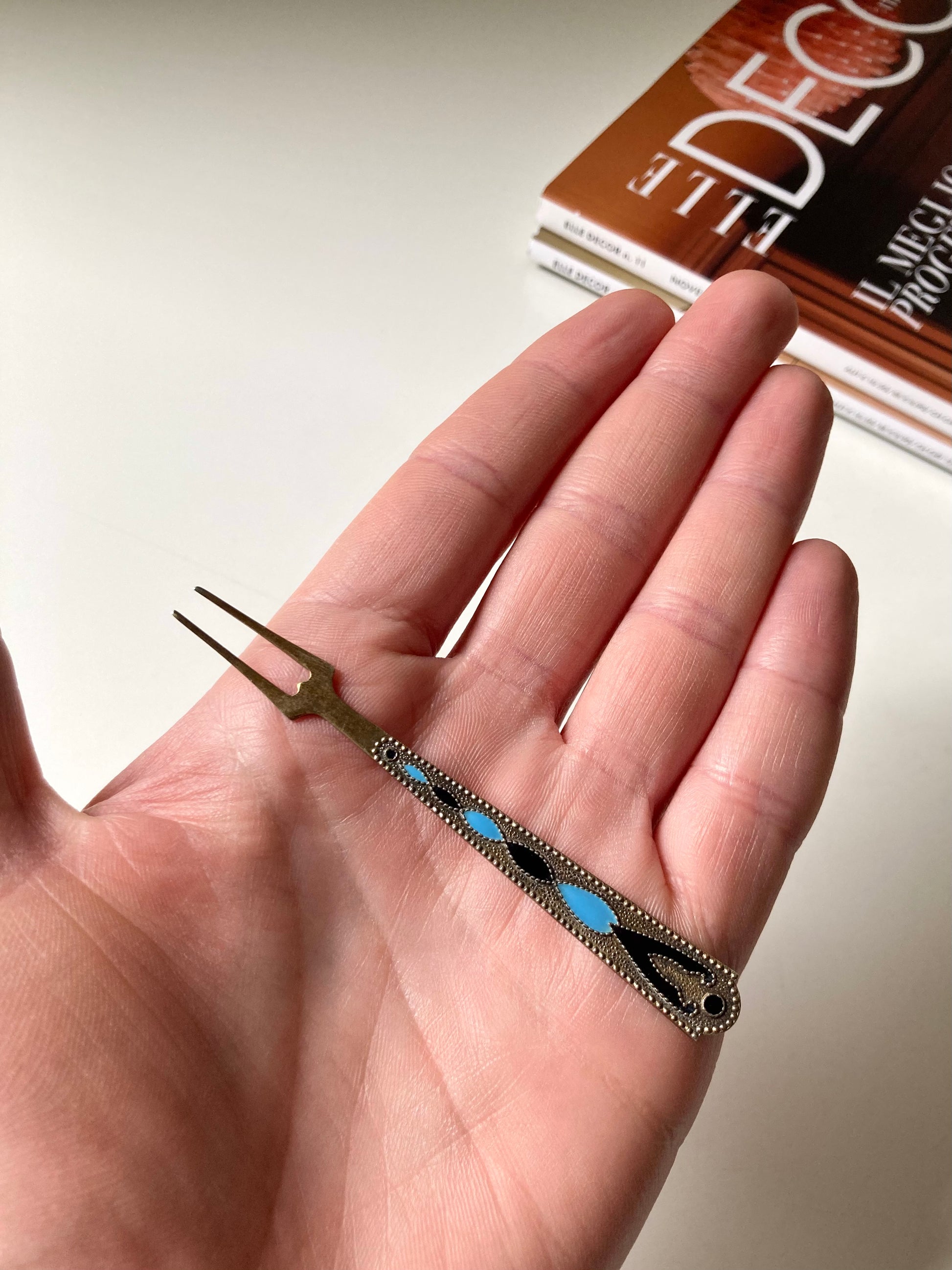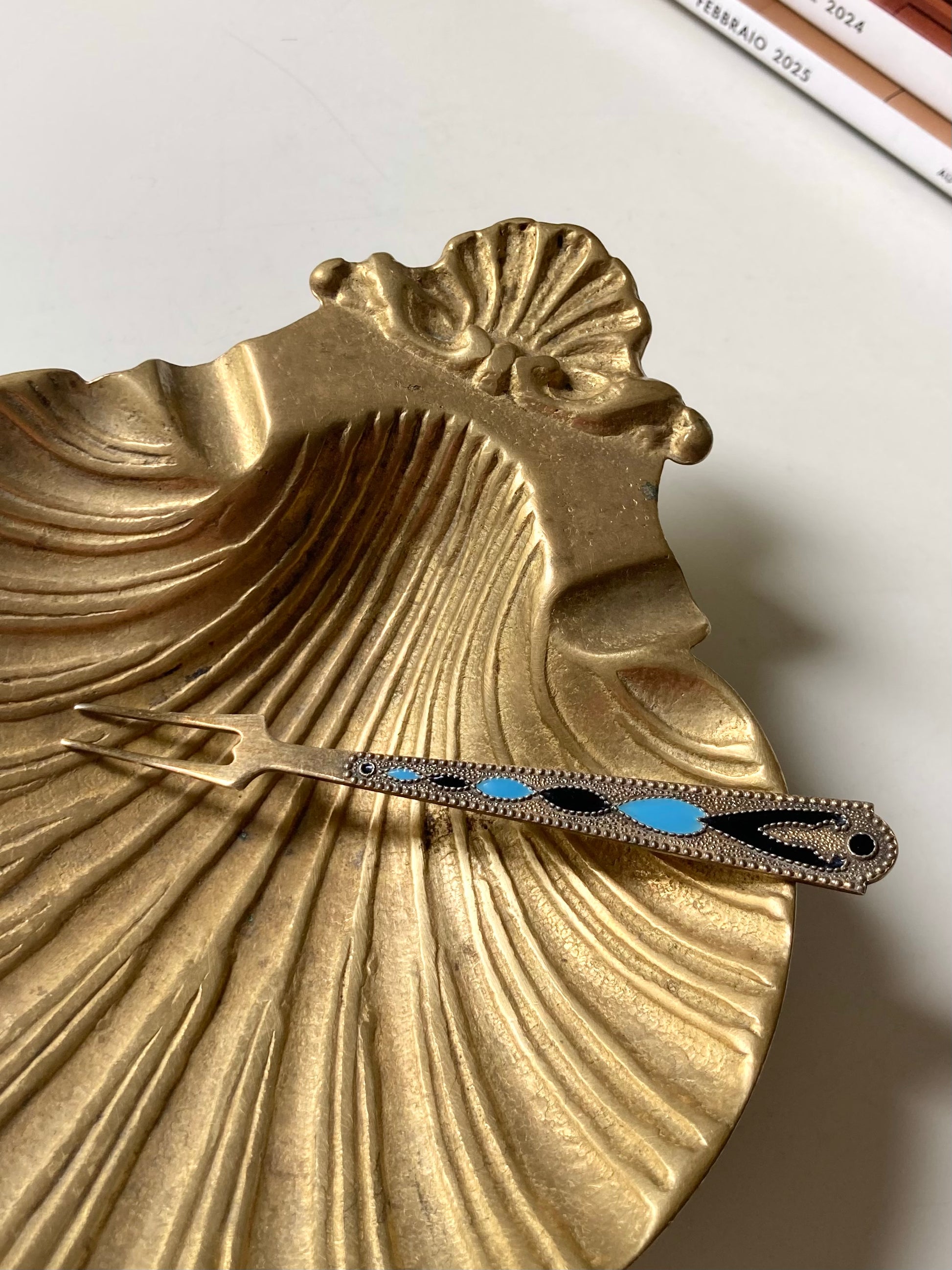 Forchettina da frutta vintage da collezione in argento 875 russo con decoro in rilievo colorato a smalto sul manico e simbolo di falce e martello URSS sul retro ⭐️