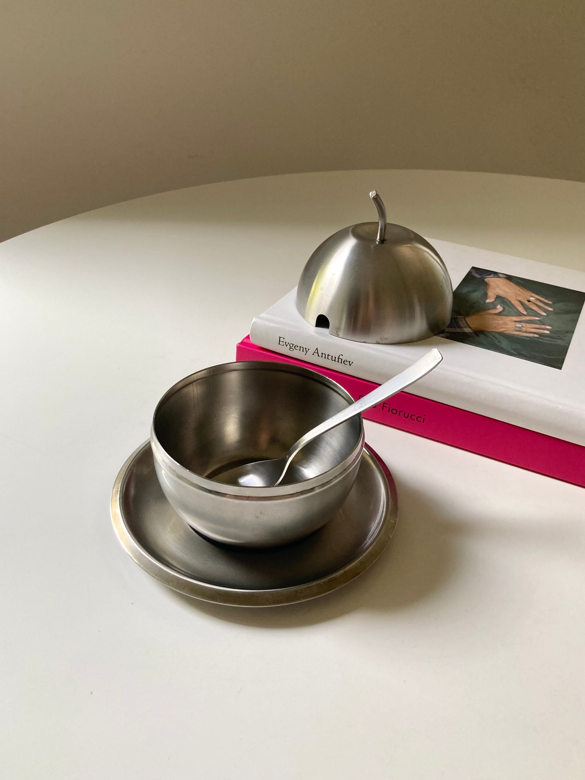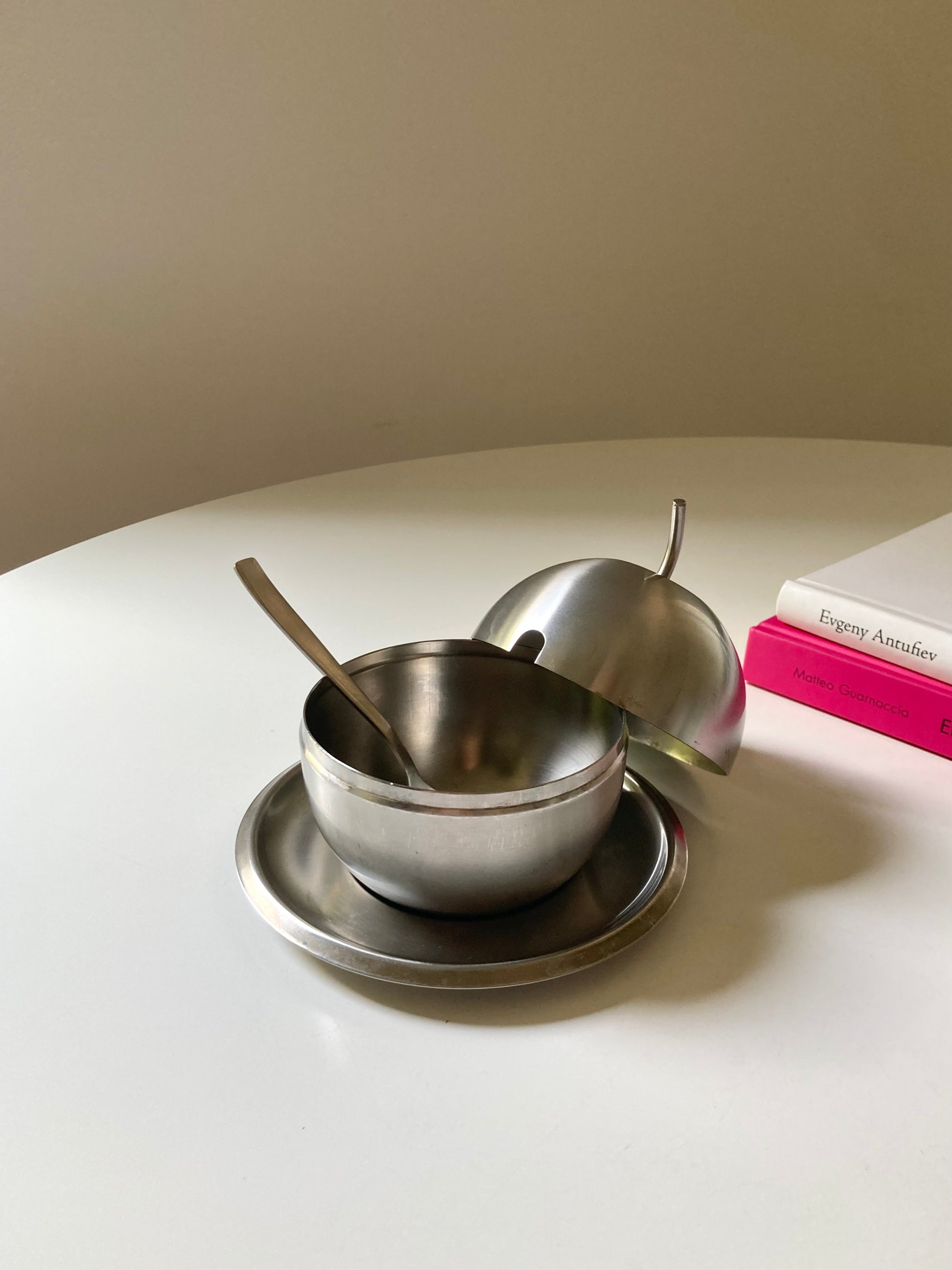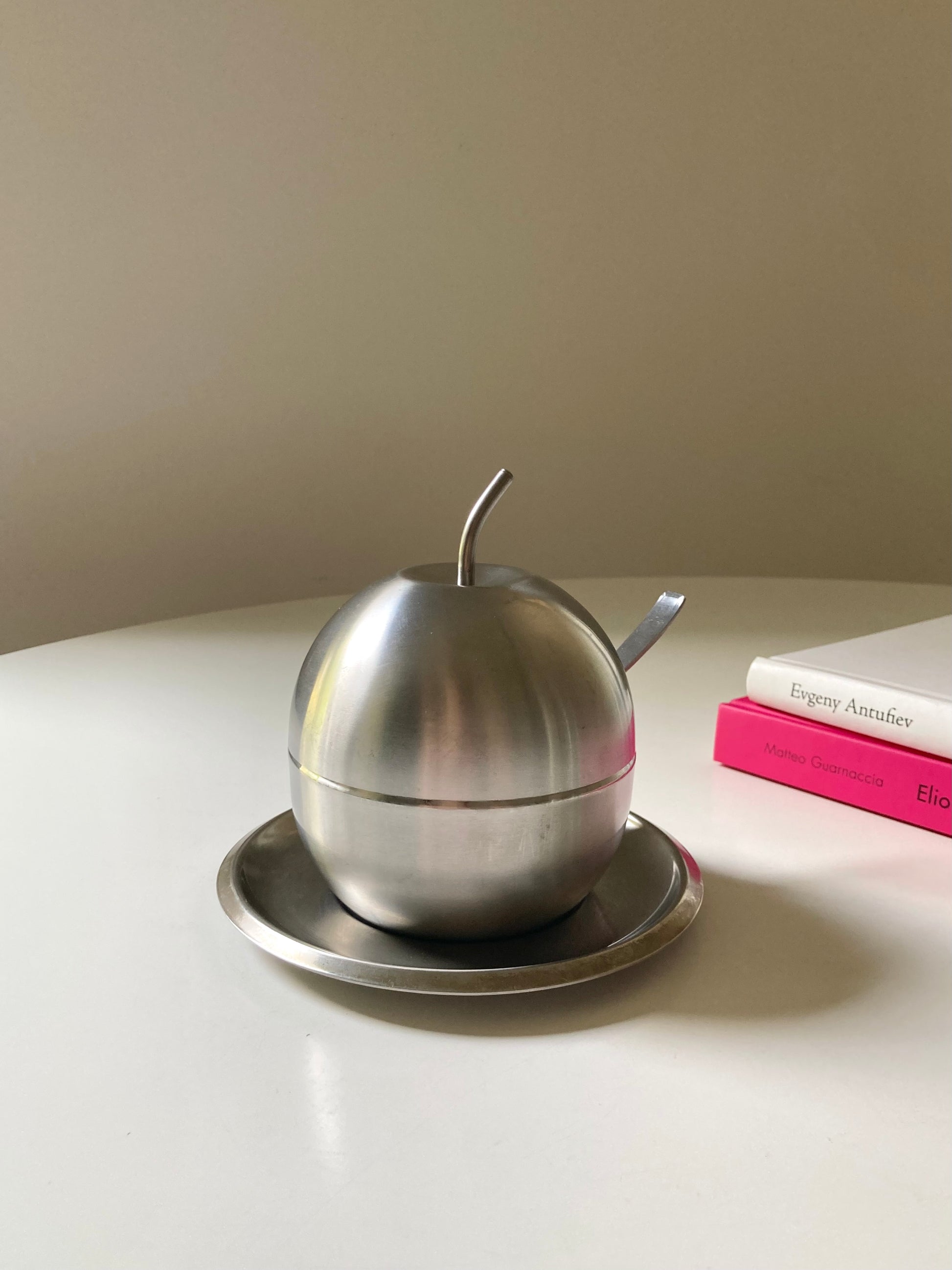 Formaggiera vintage in acciaio a forma di mela completa di cucchiaino e piatto