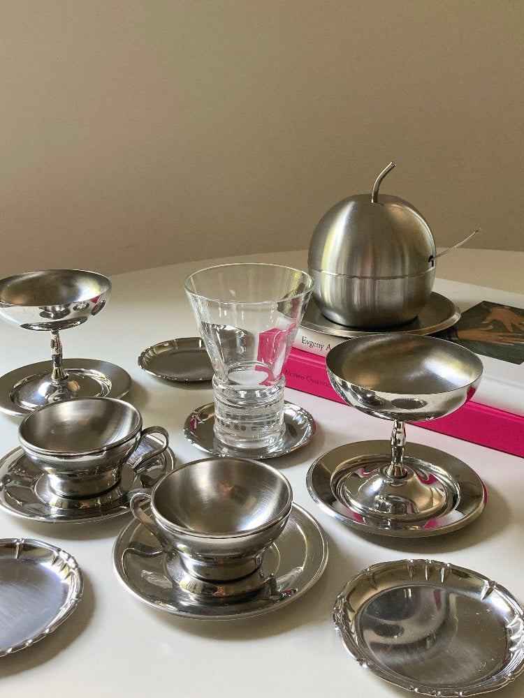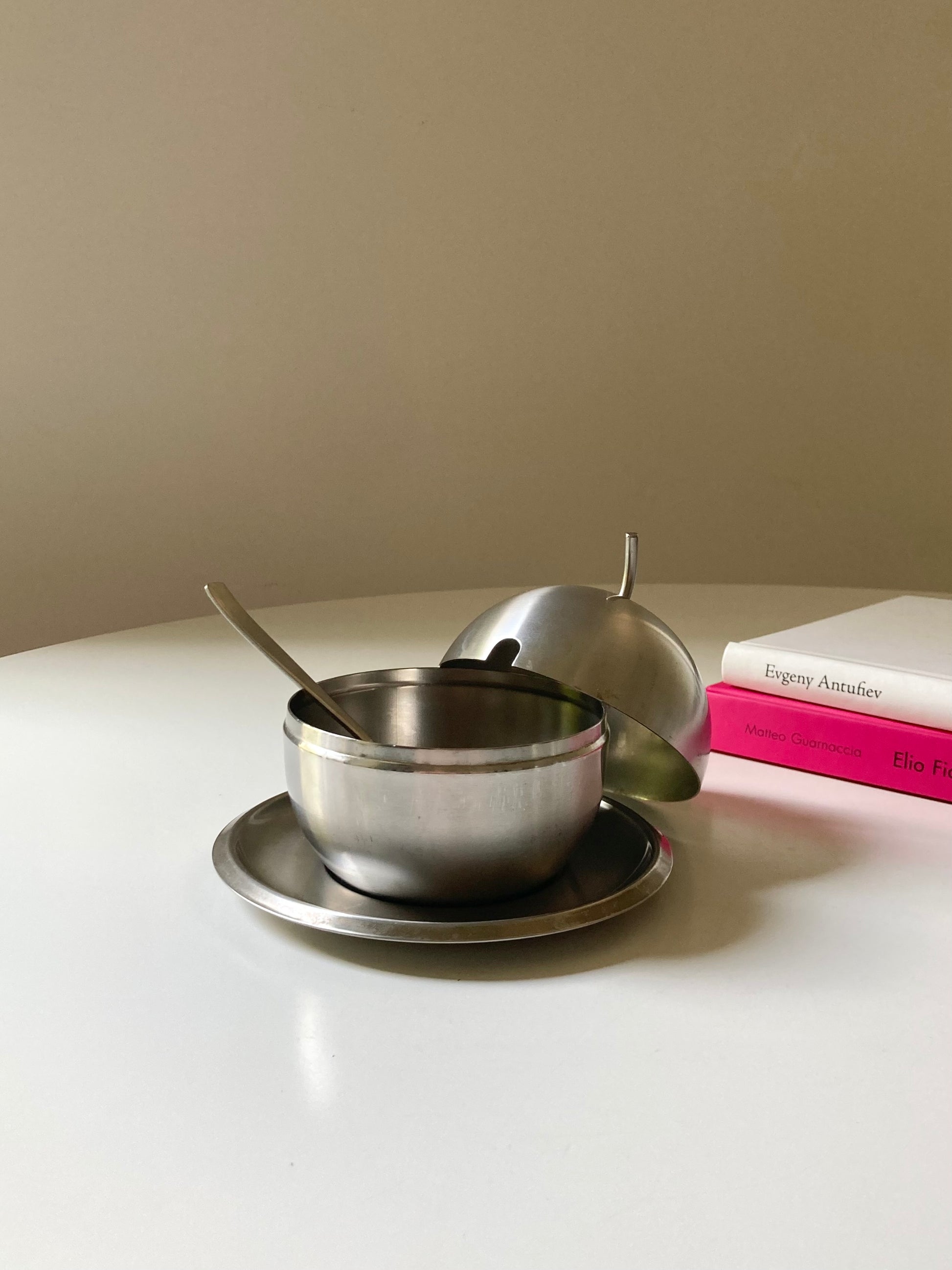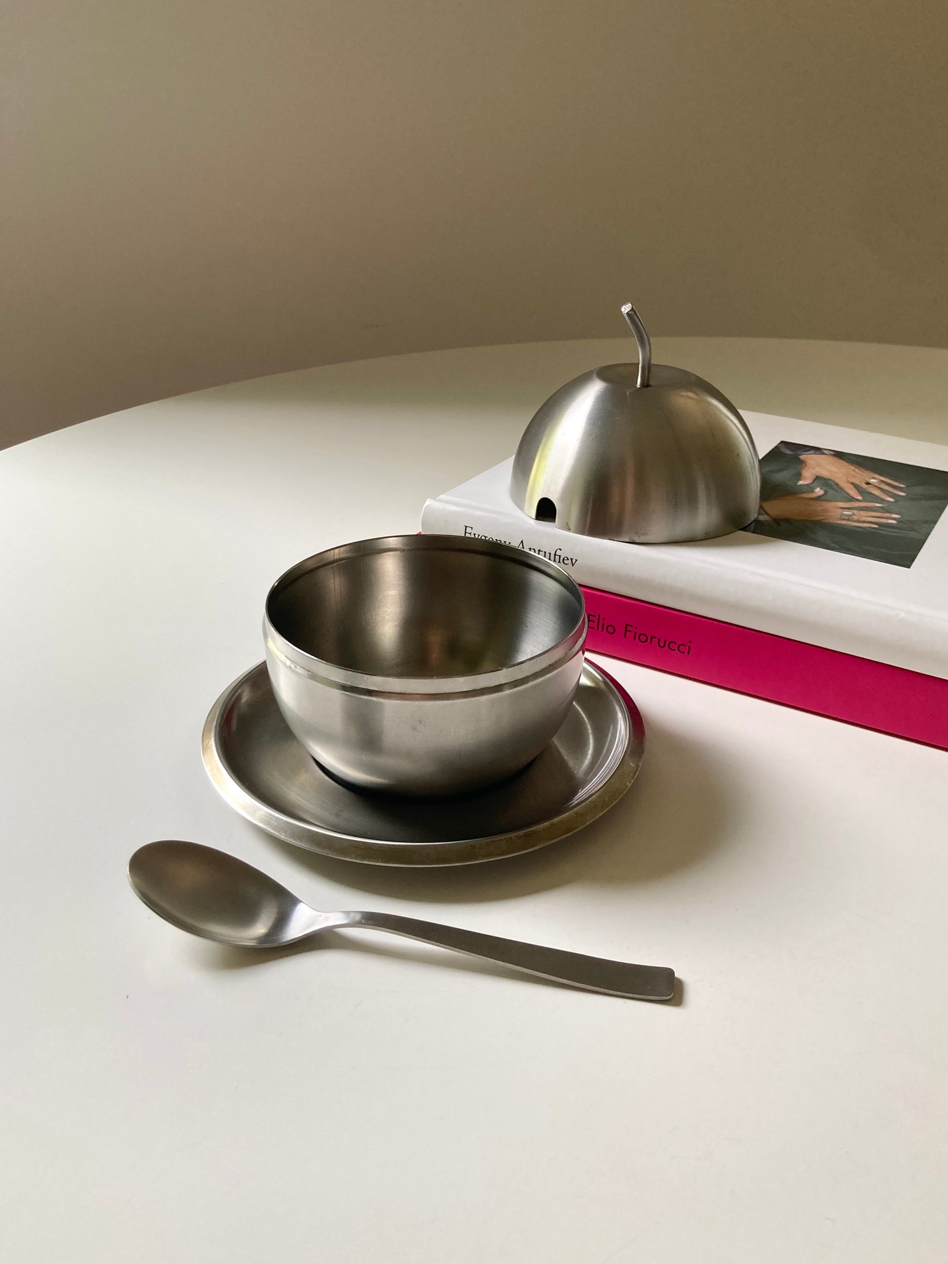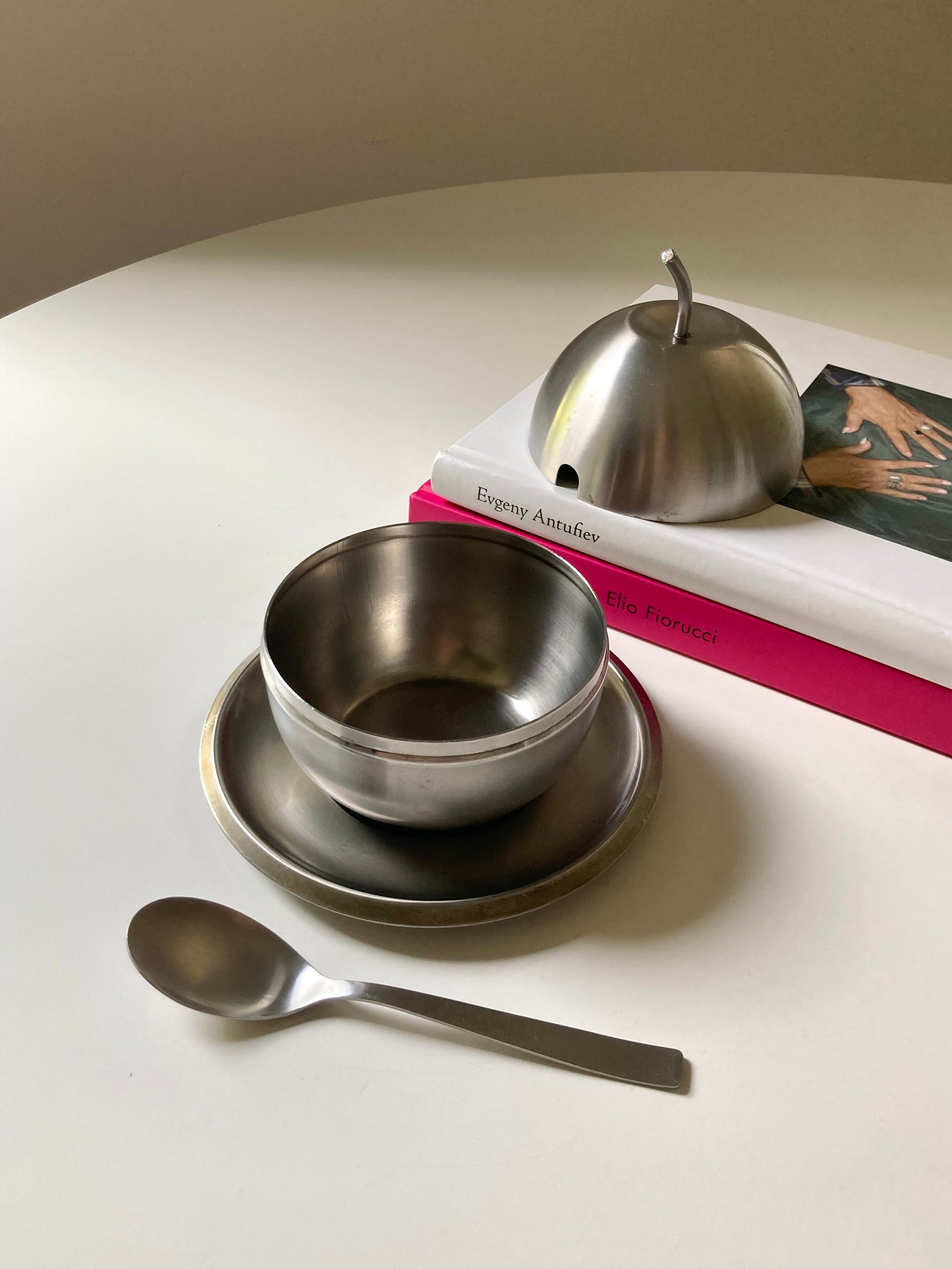 Formaggiera vintage in acciaio a forma di mela completa di cucchiaino e piatto