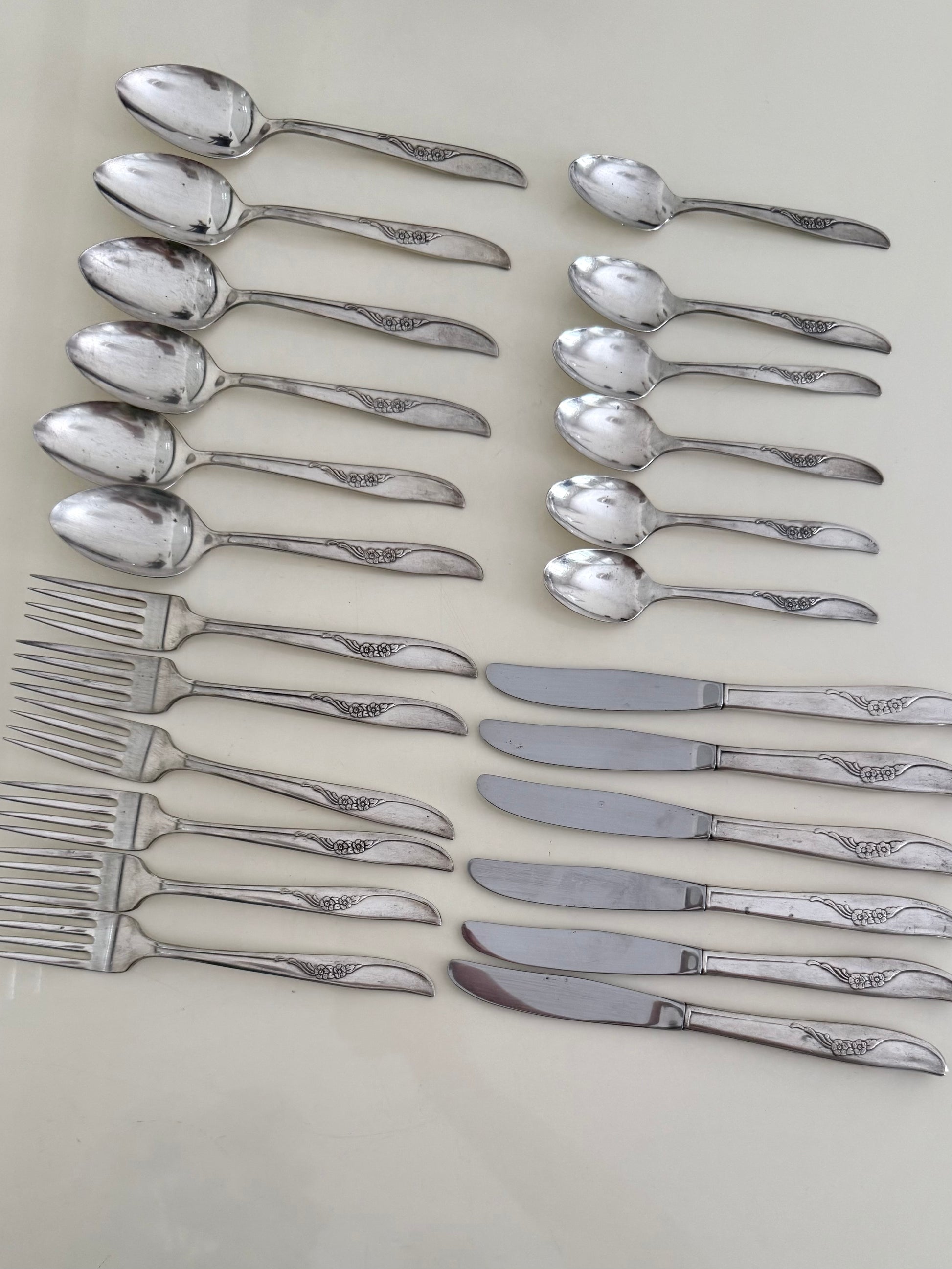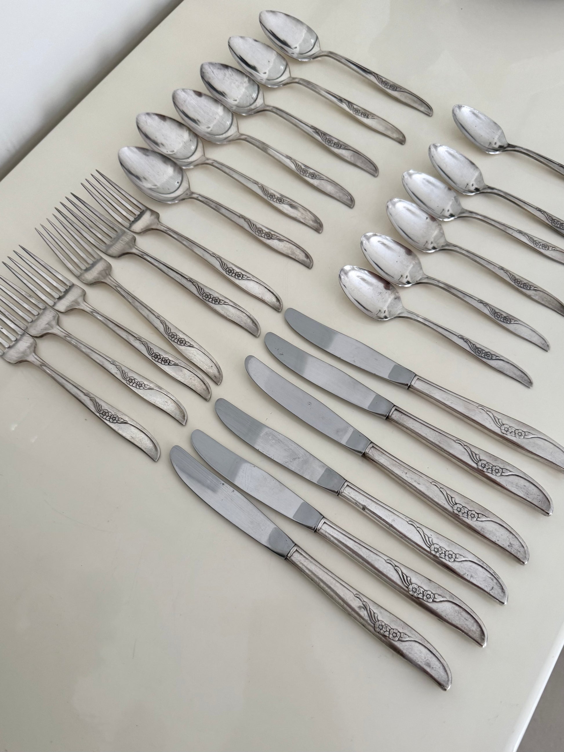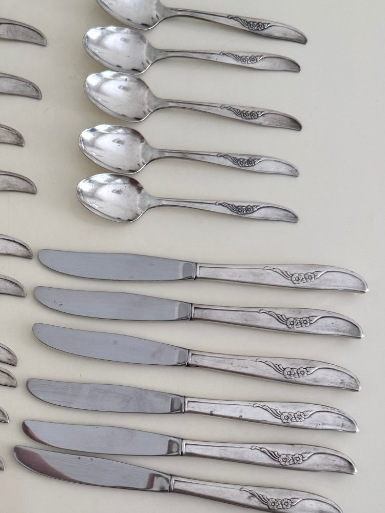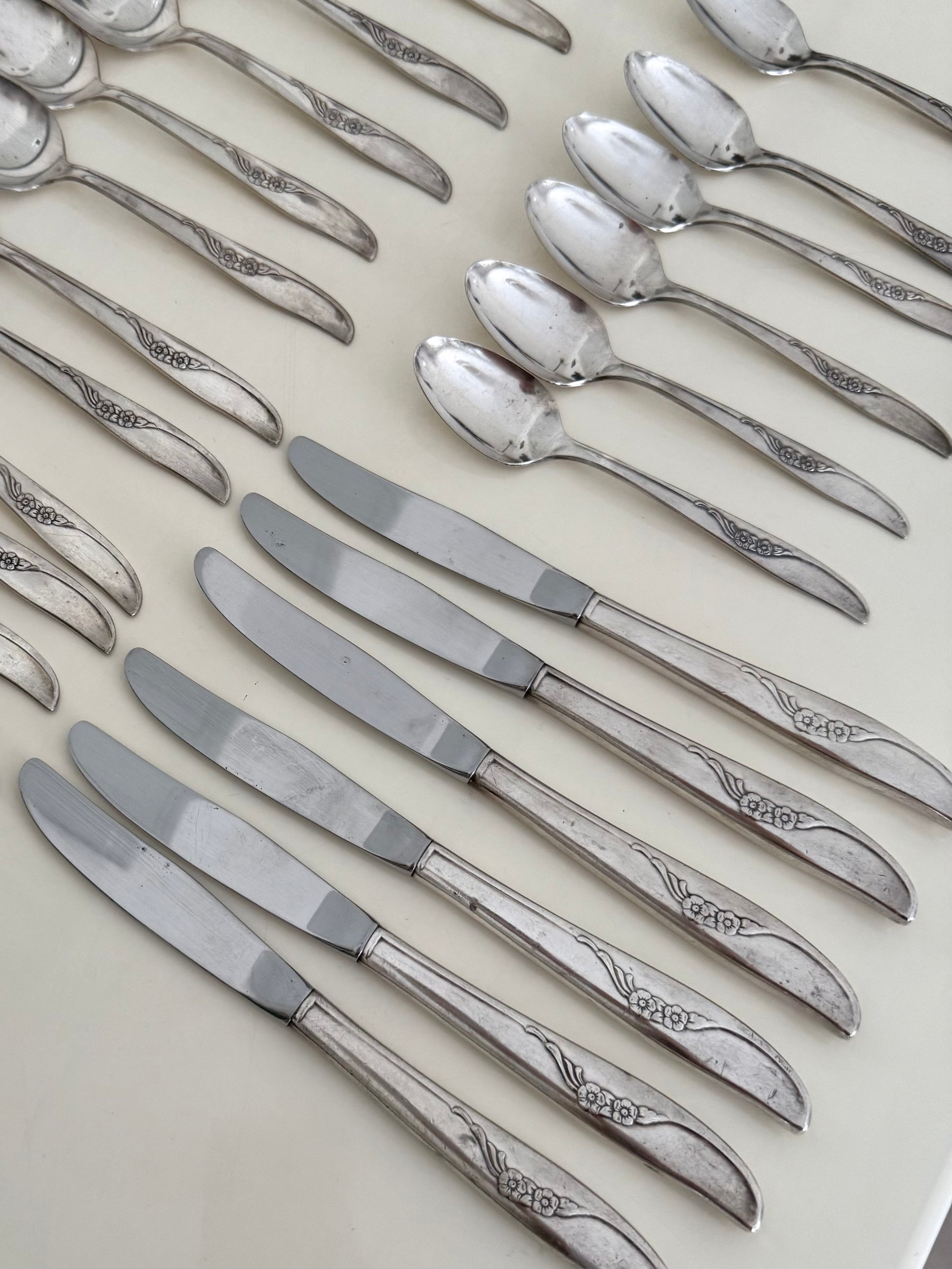 Servizio completo di 24 posate vintage per 6 persone con decoro di fiorellini sul manico e composto da 6 cucchiai, 6 forchette, 6 coltelli e 6 cucchiaini 🌸