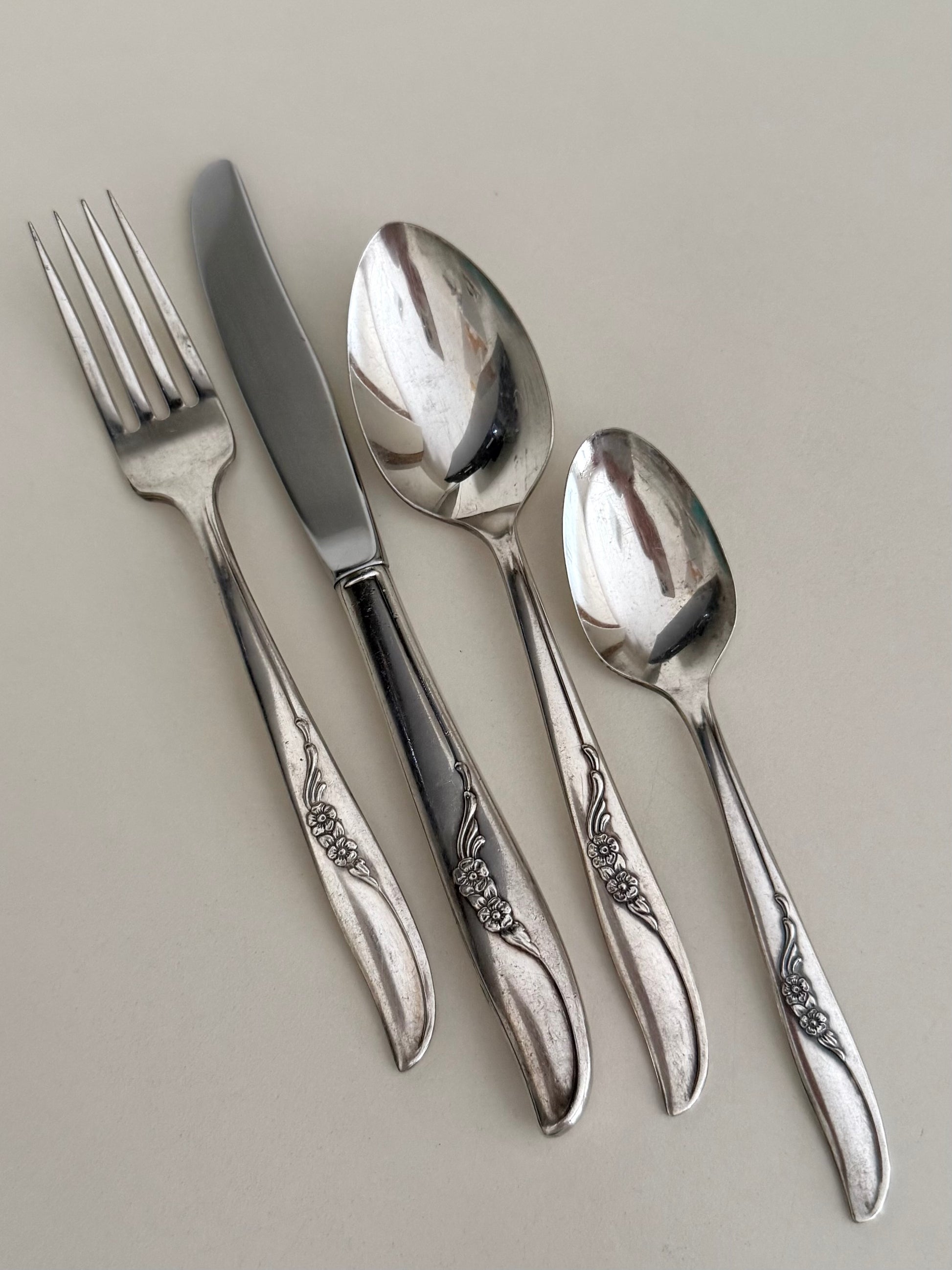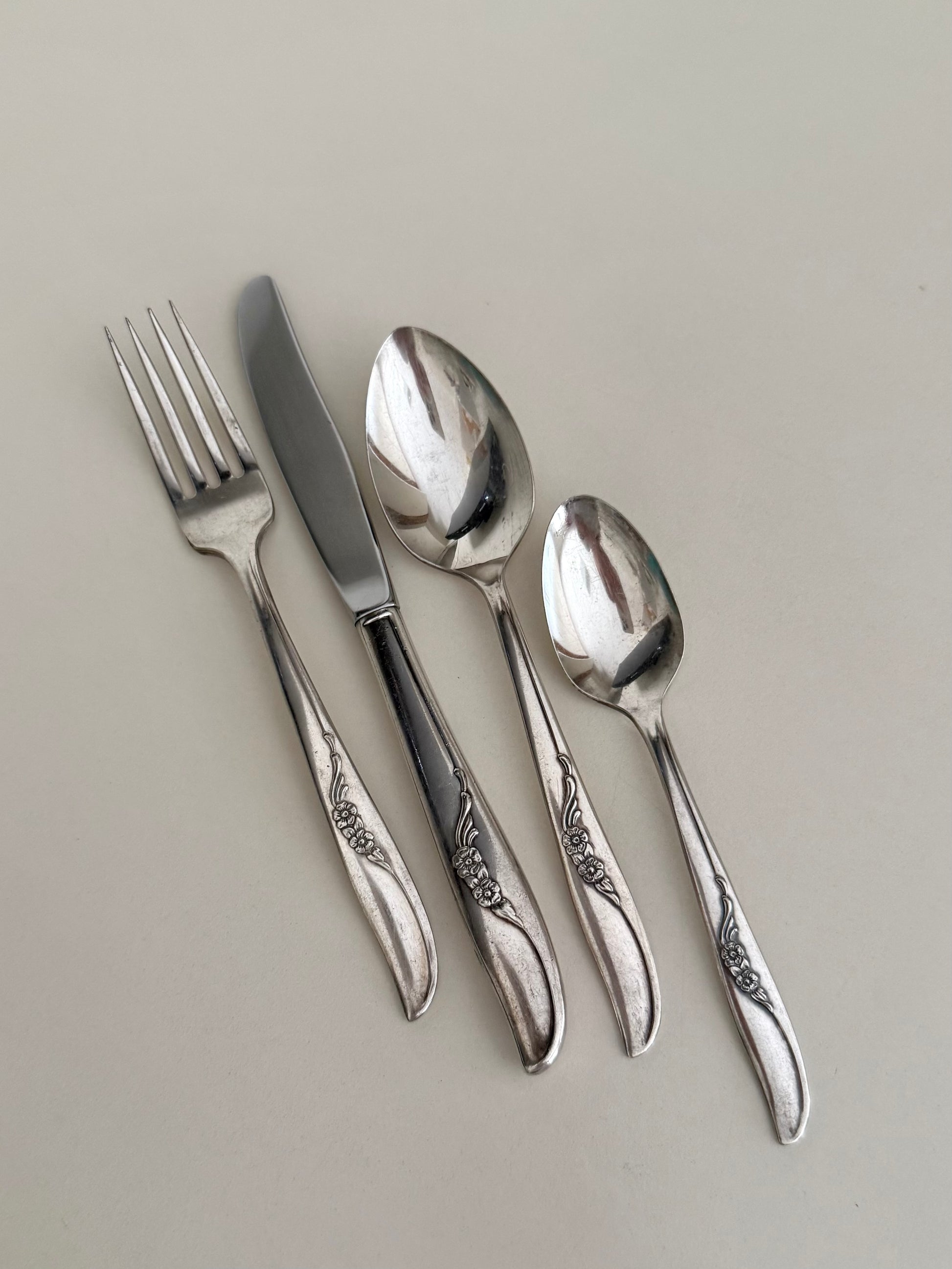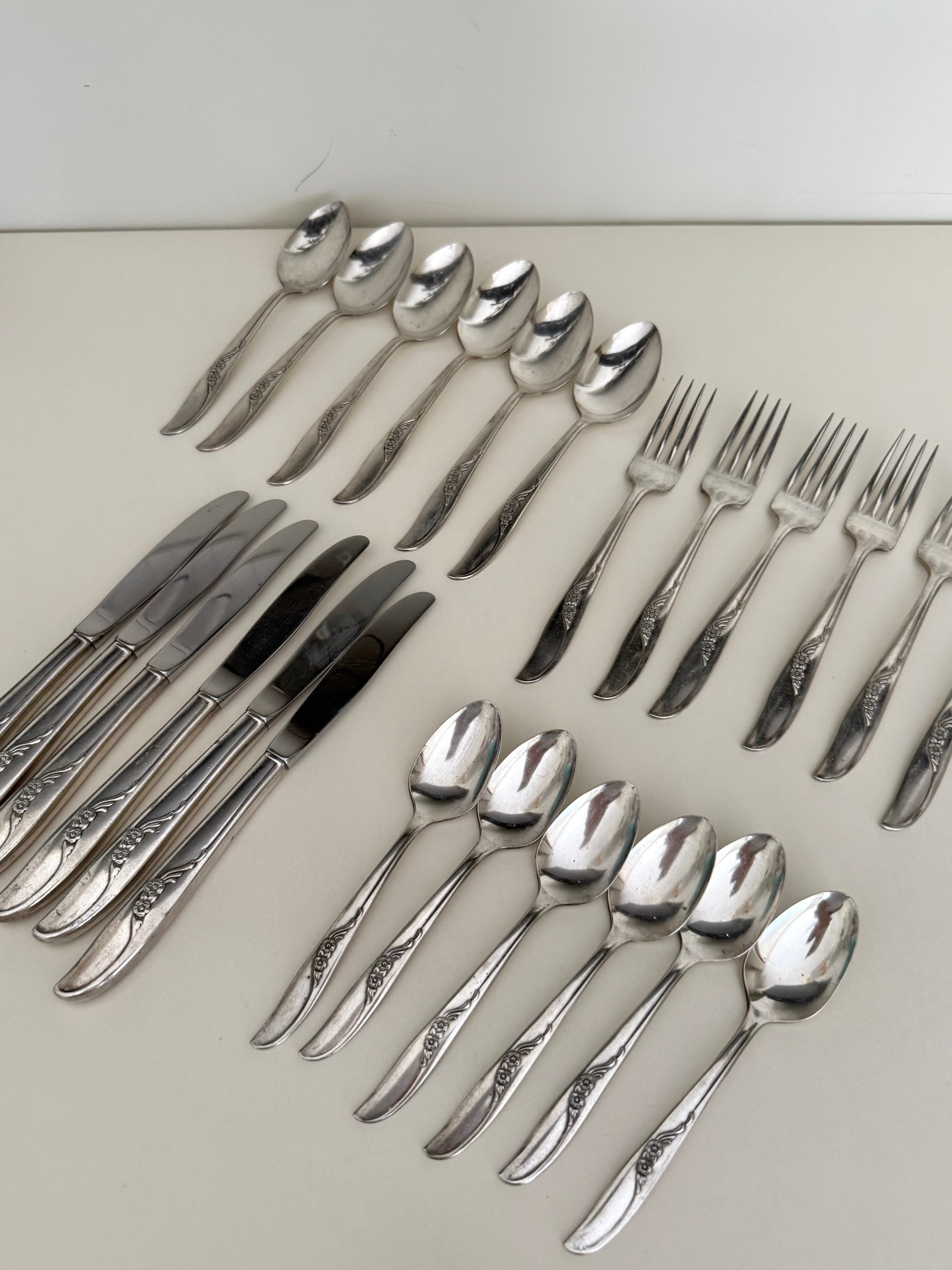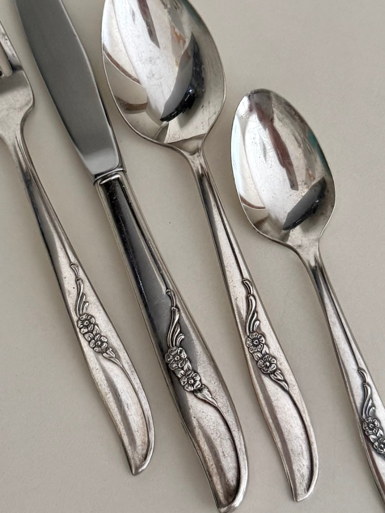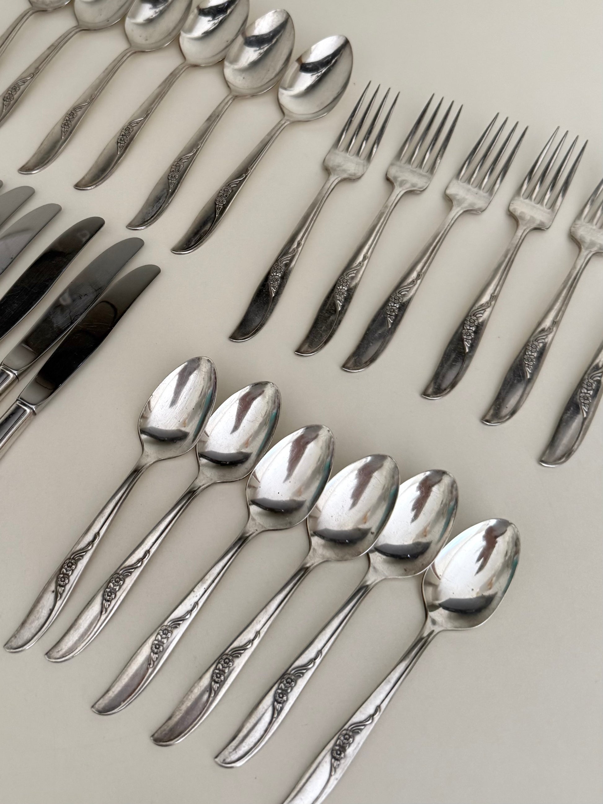 Servizio completo di 24 posate vintage per 6 persone con decoro di fiorellini sul manico e composto da 6 cucchiai, 6 forchette, 6 coltelli e 6 cucchiaini 🌸