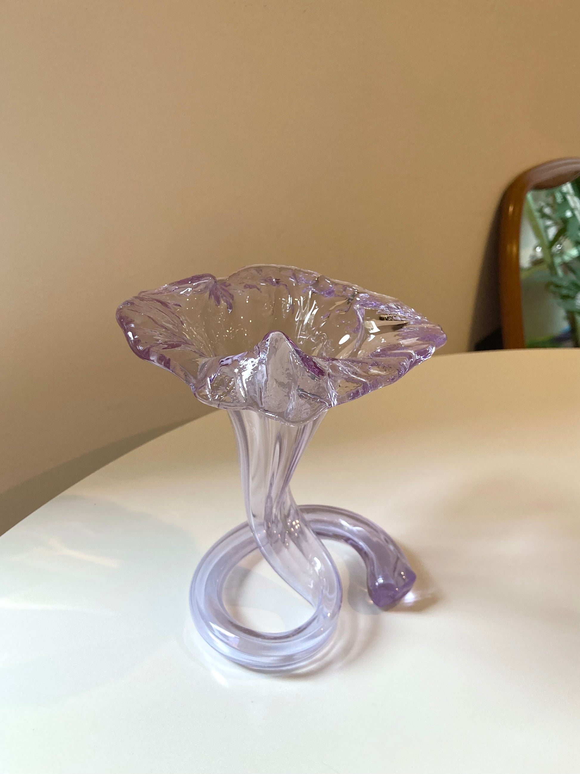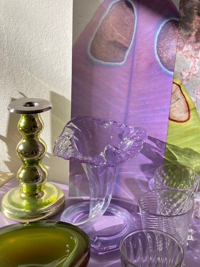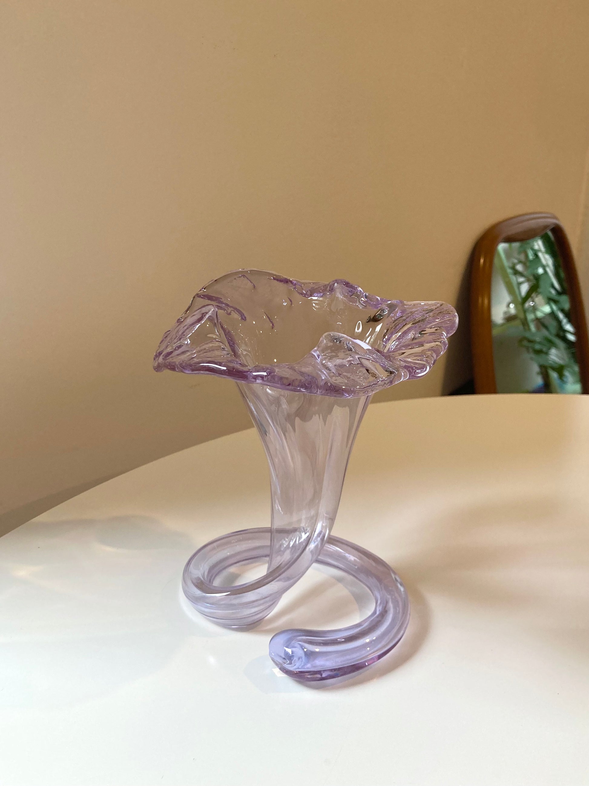 Set di 6 bicchieri vintage anni ‘70 in vetro viola alessandrite di altezza 13cm insieme a vaso a forma di fiore con base a ricciolo in vetro alessandrite.