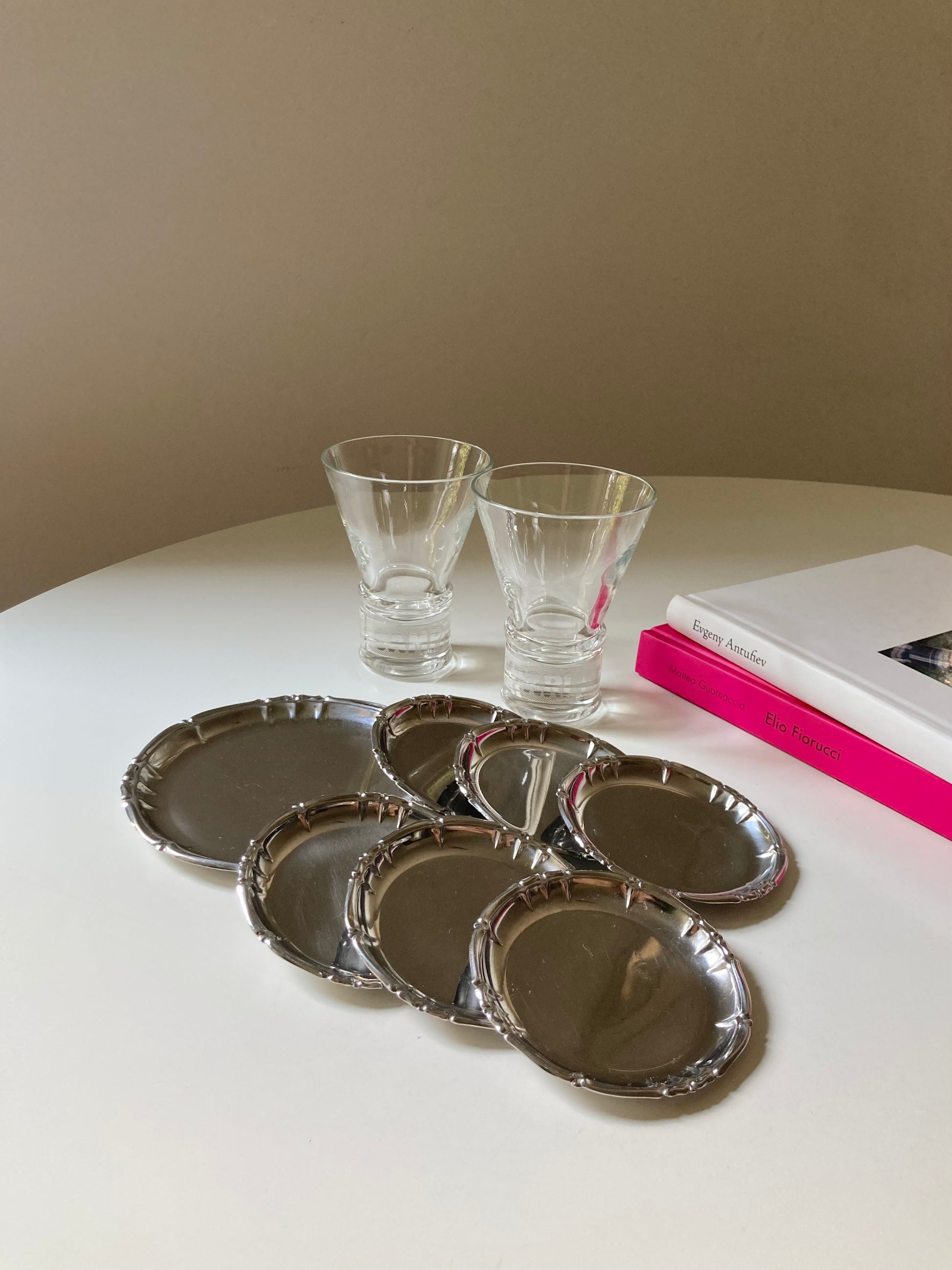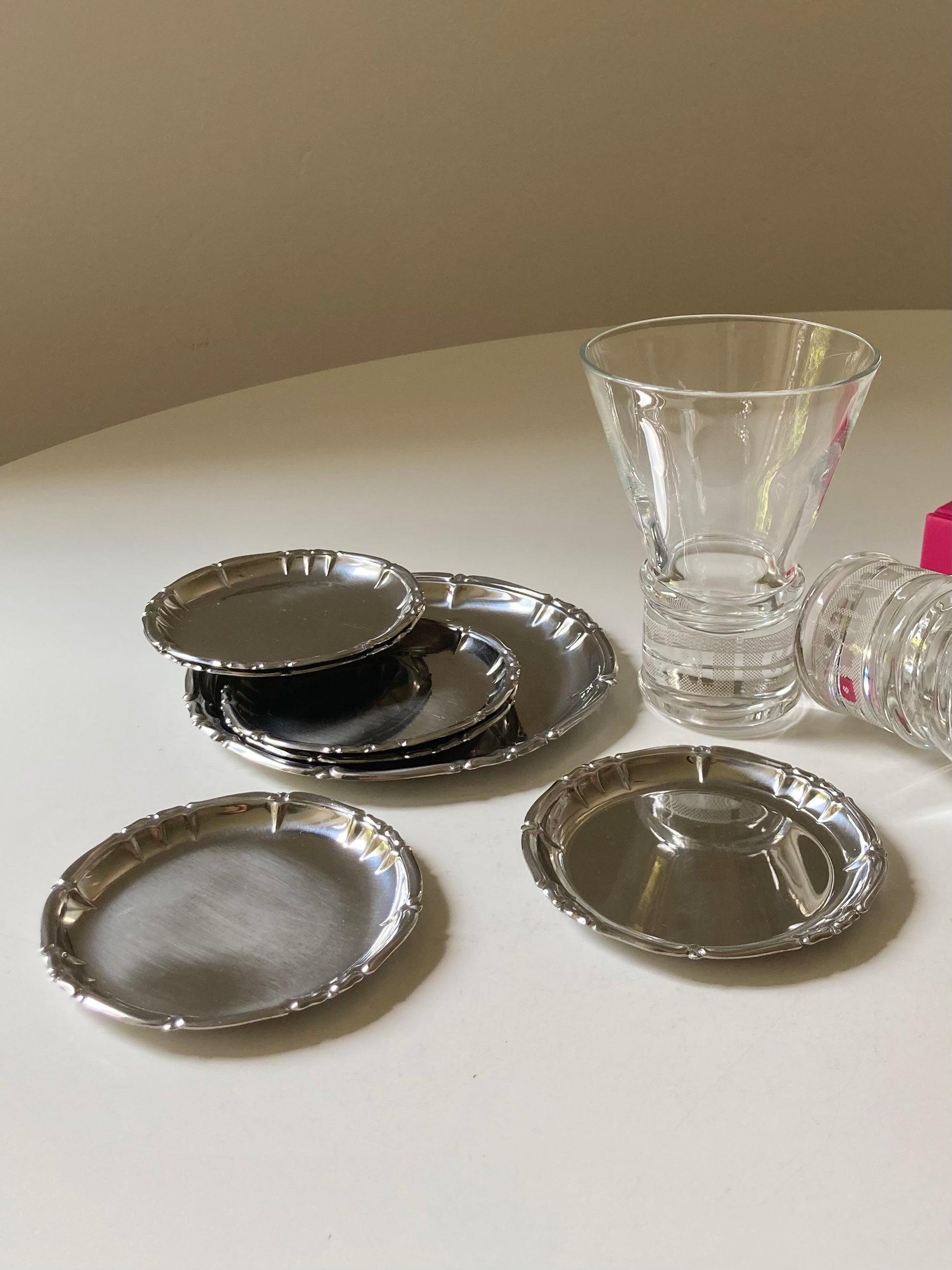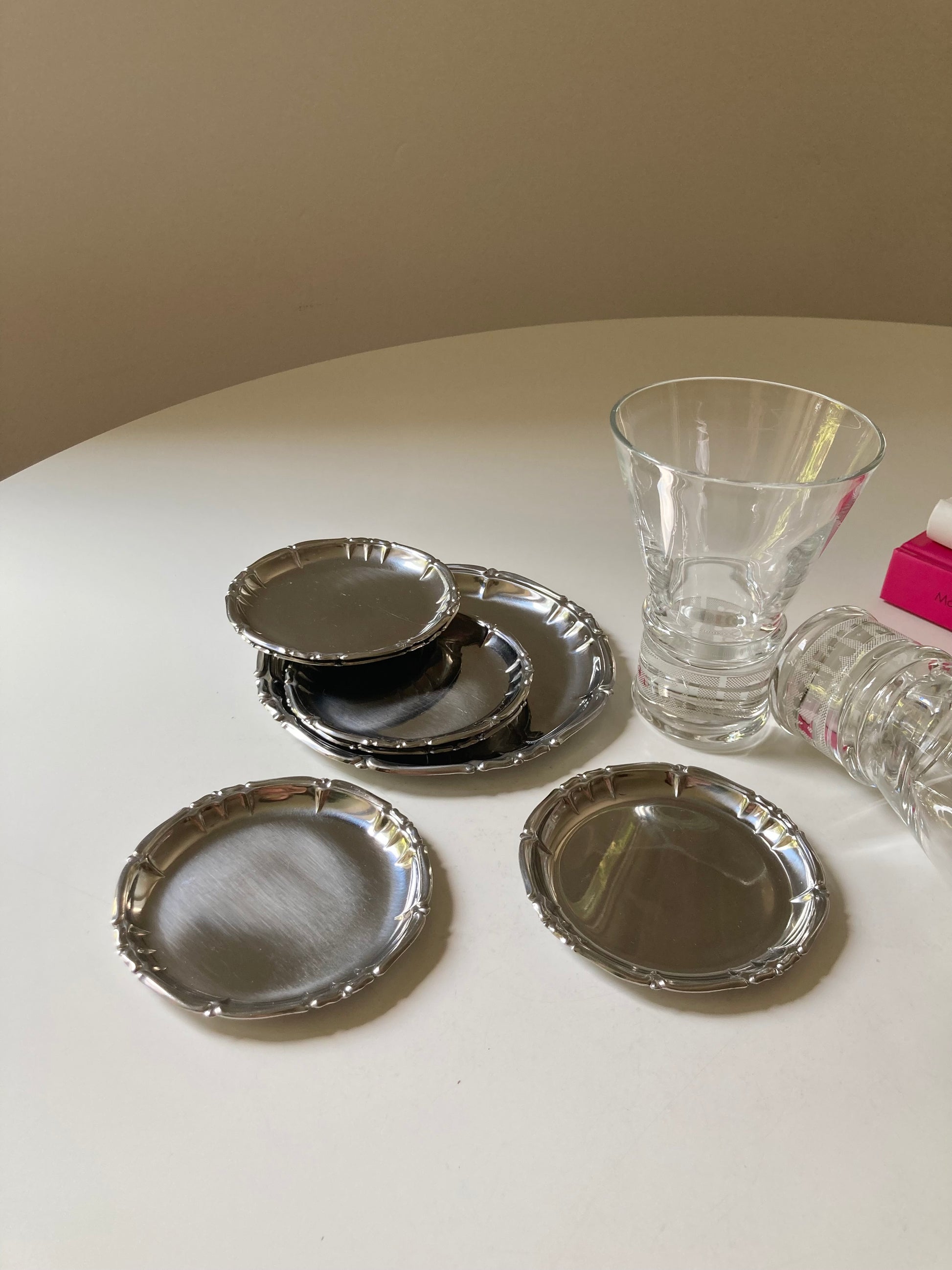 Set vintage completo di 6 sottobicchieri e sottobottiglia in acciaio