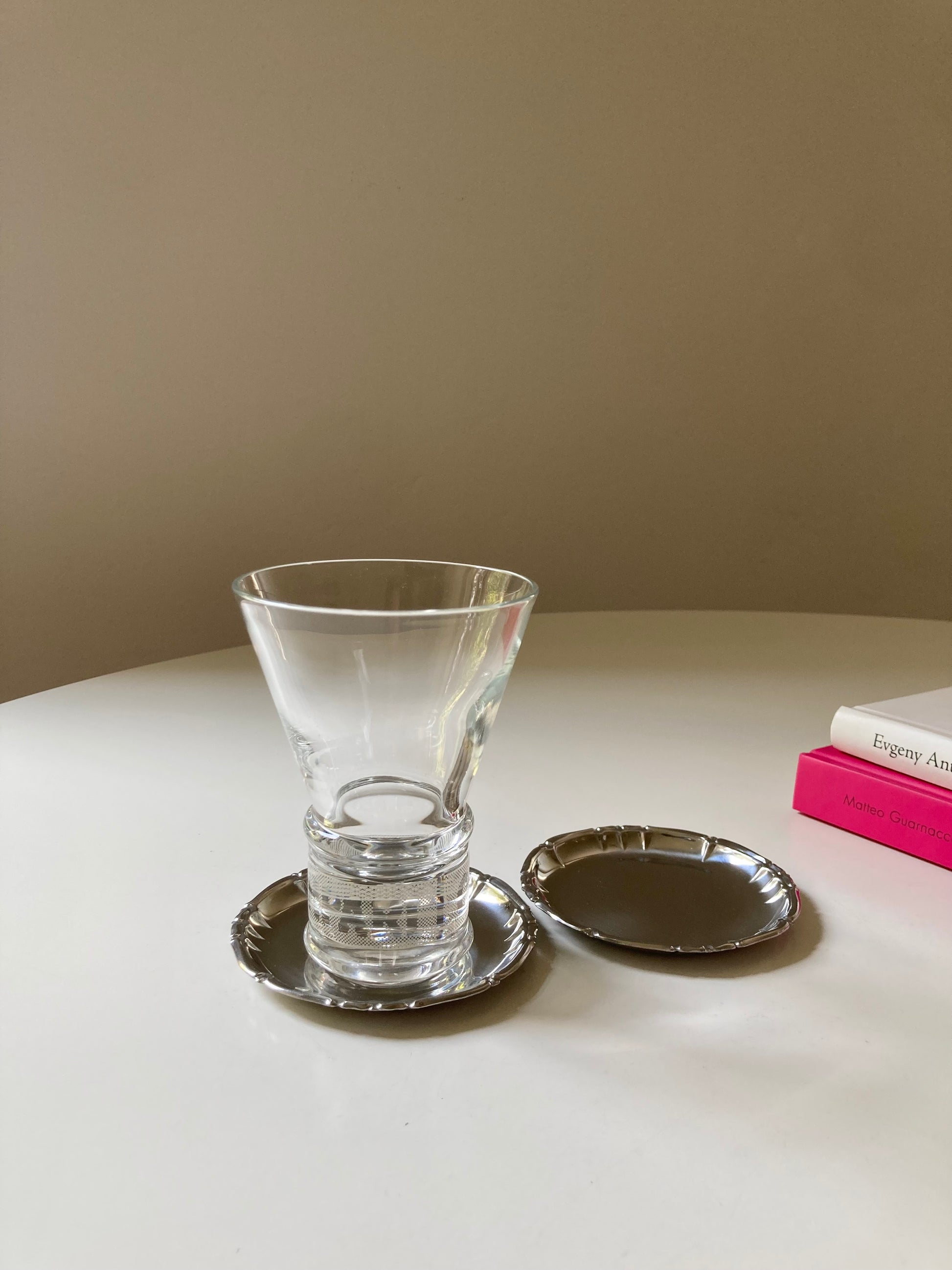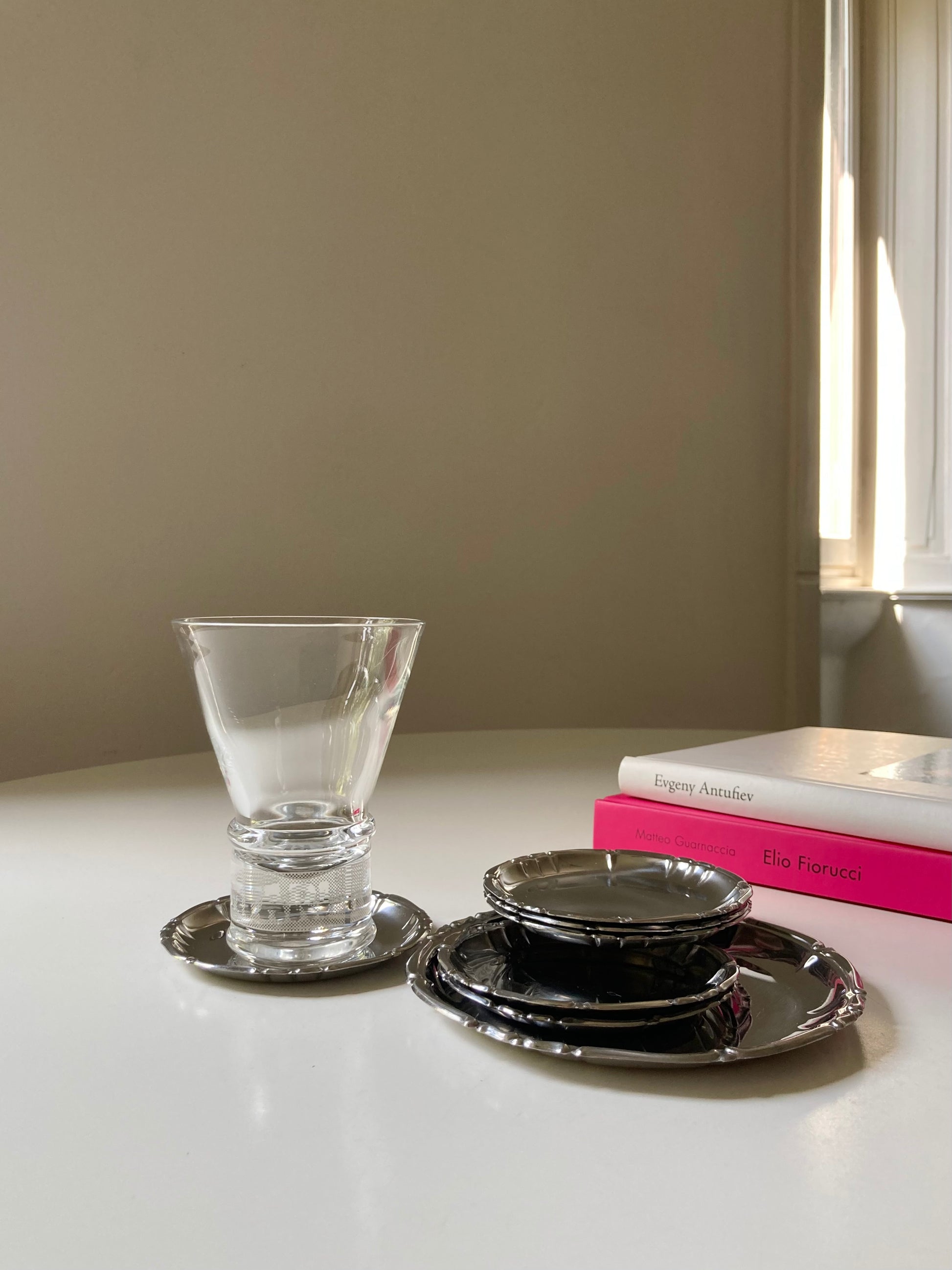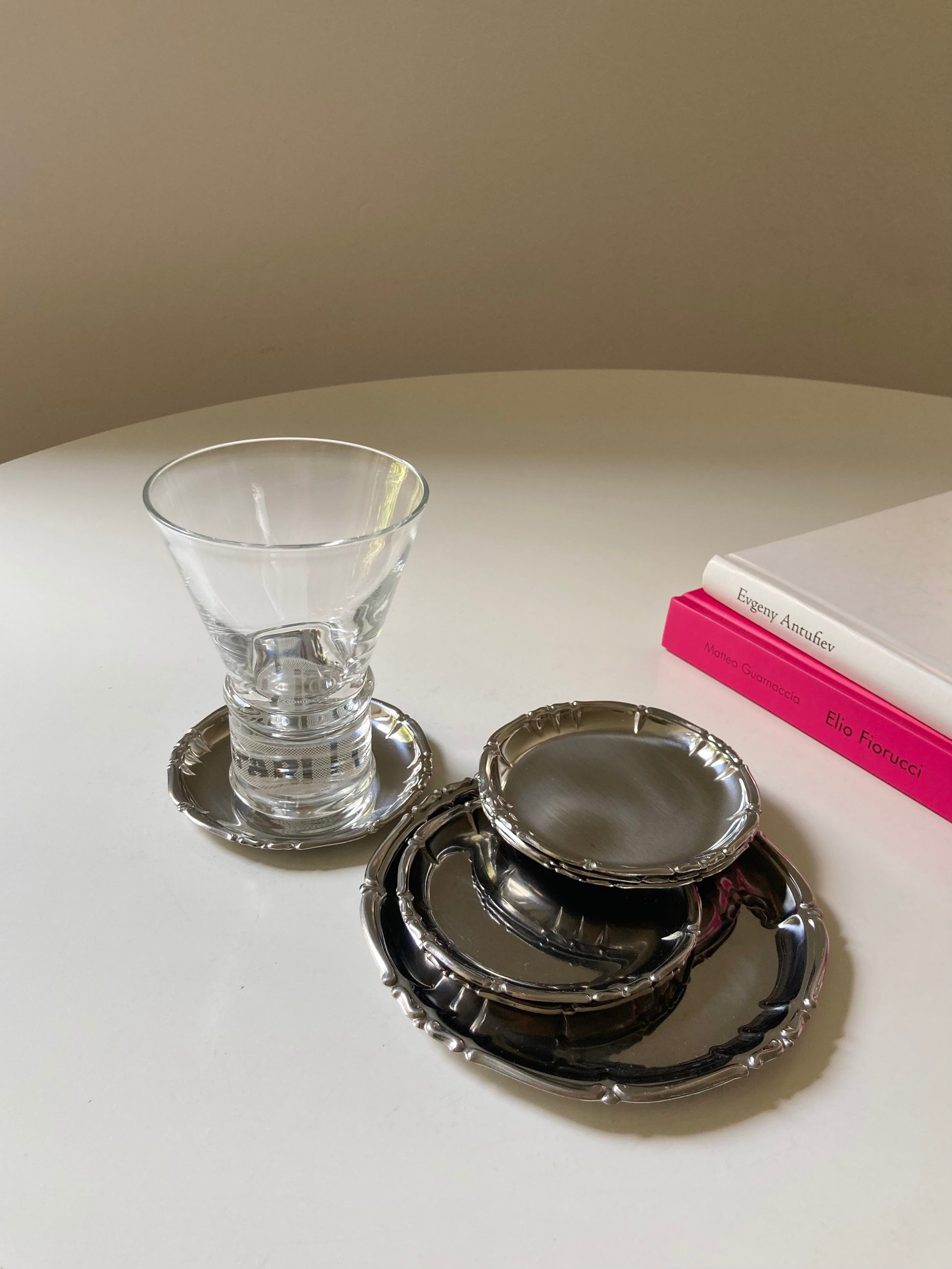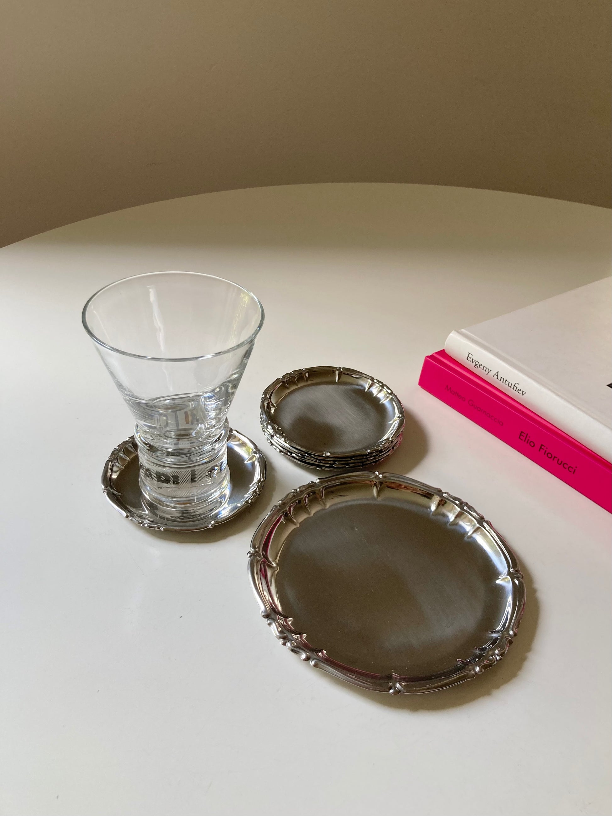 Set vintage completo di 6 sottobicchieri e sottobottiglia in acciaio