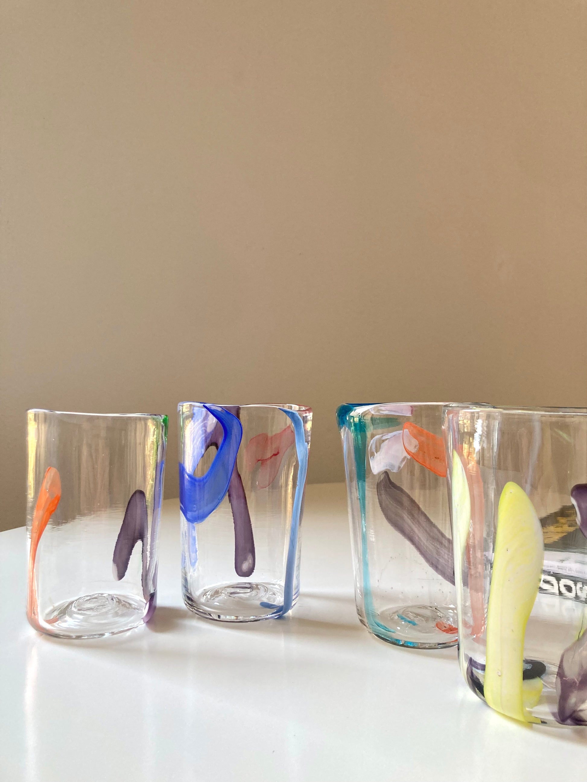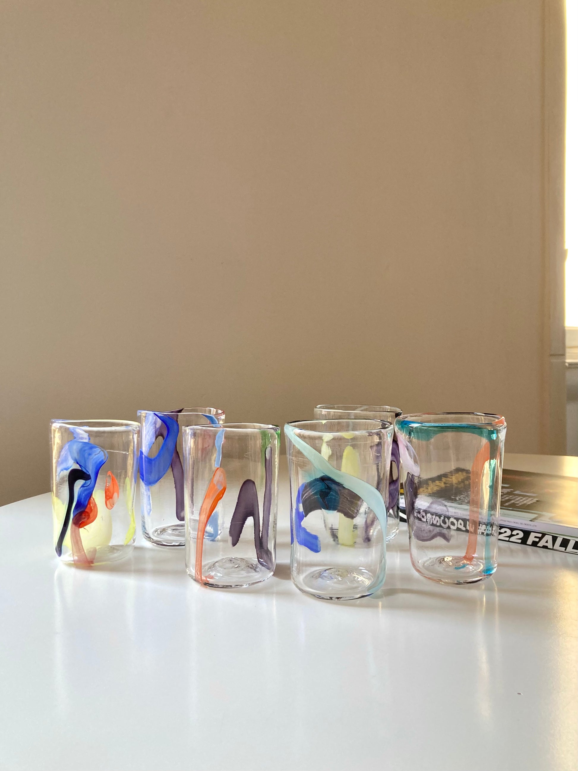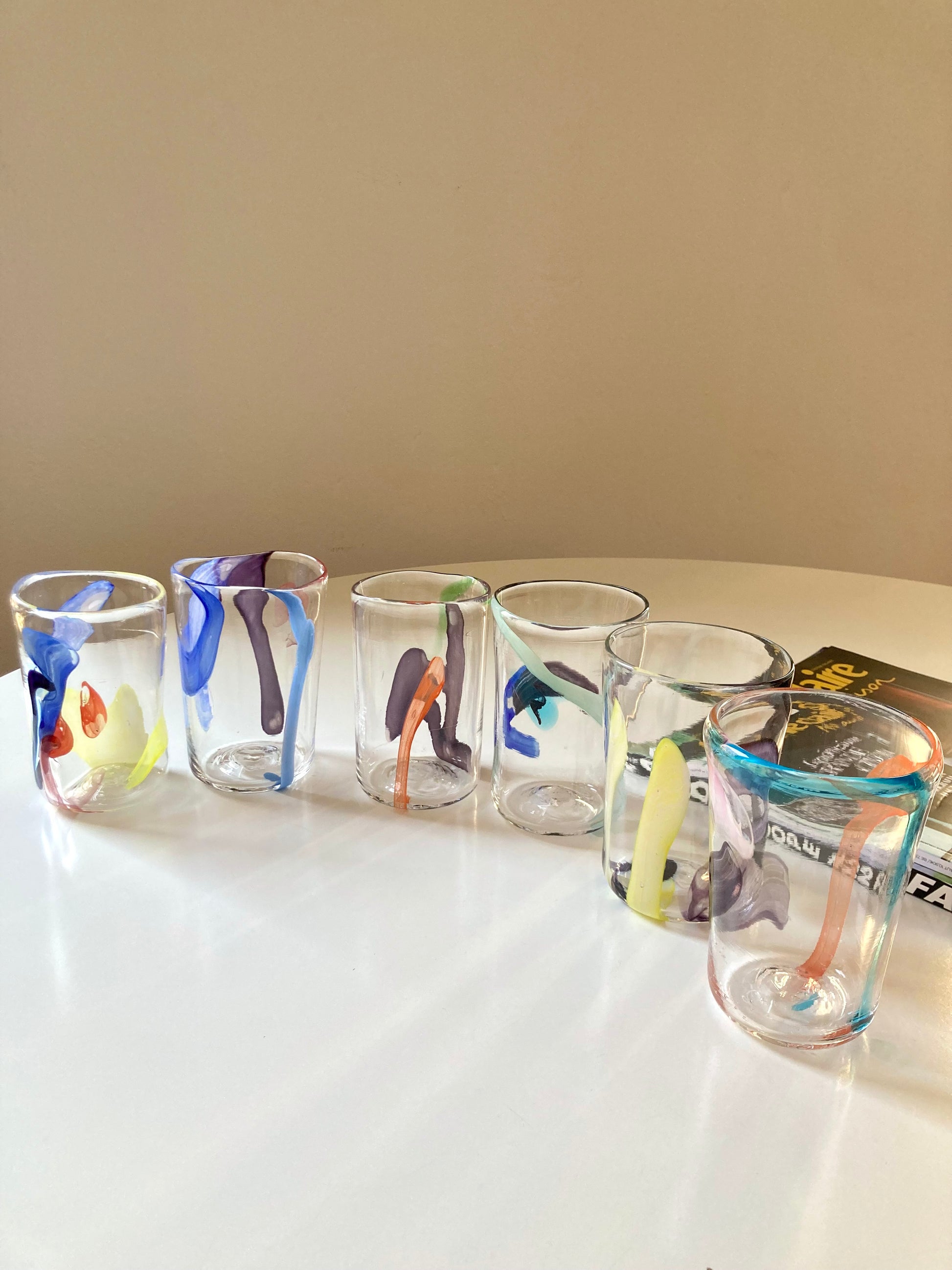 Set di 6 bicchieri goti veneziani da vino o acqua realizzati interamente a mano in vetro di Murano e decorati con linee e forme astratte che rendono ciascun bicchiere unico e diverso dagli altri 🎨