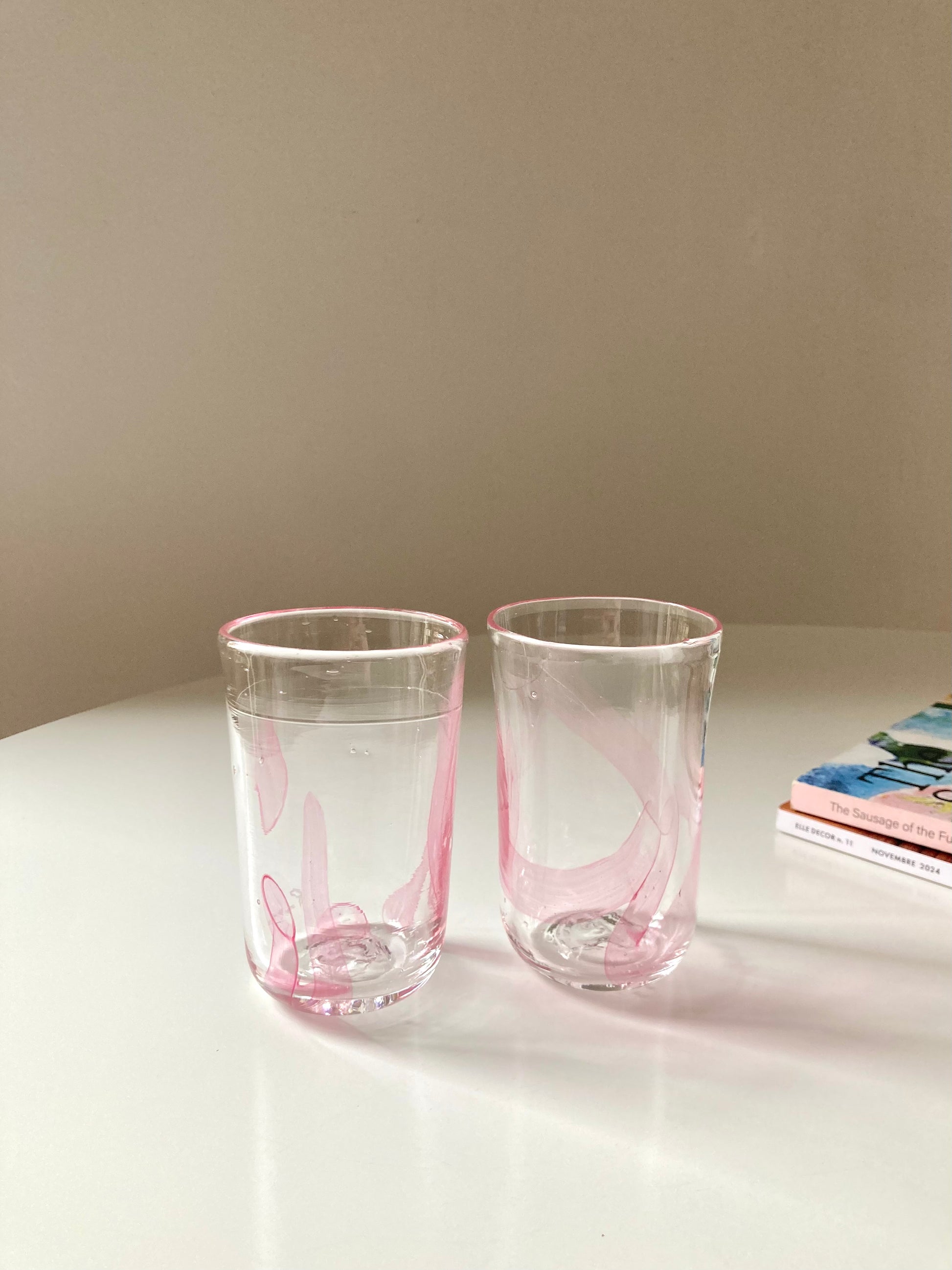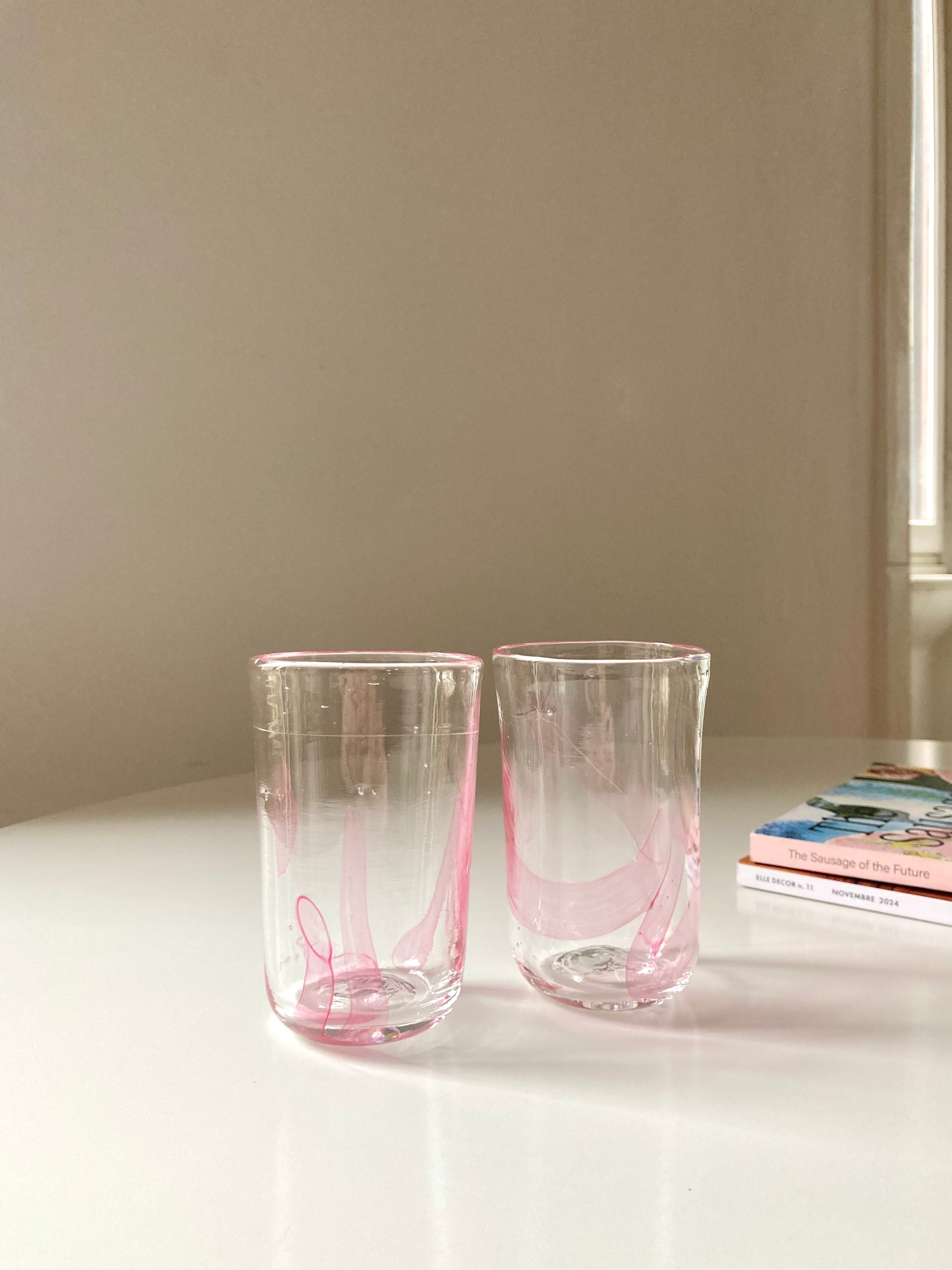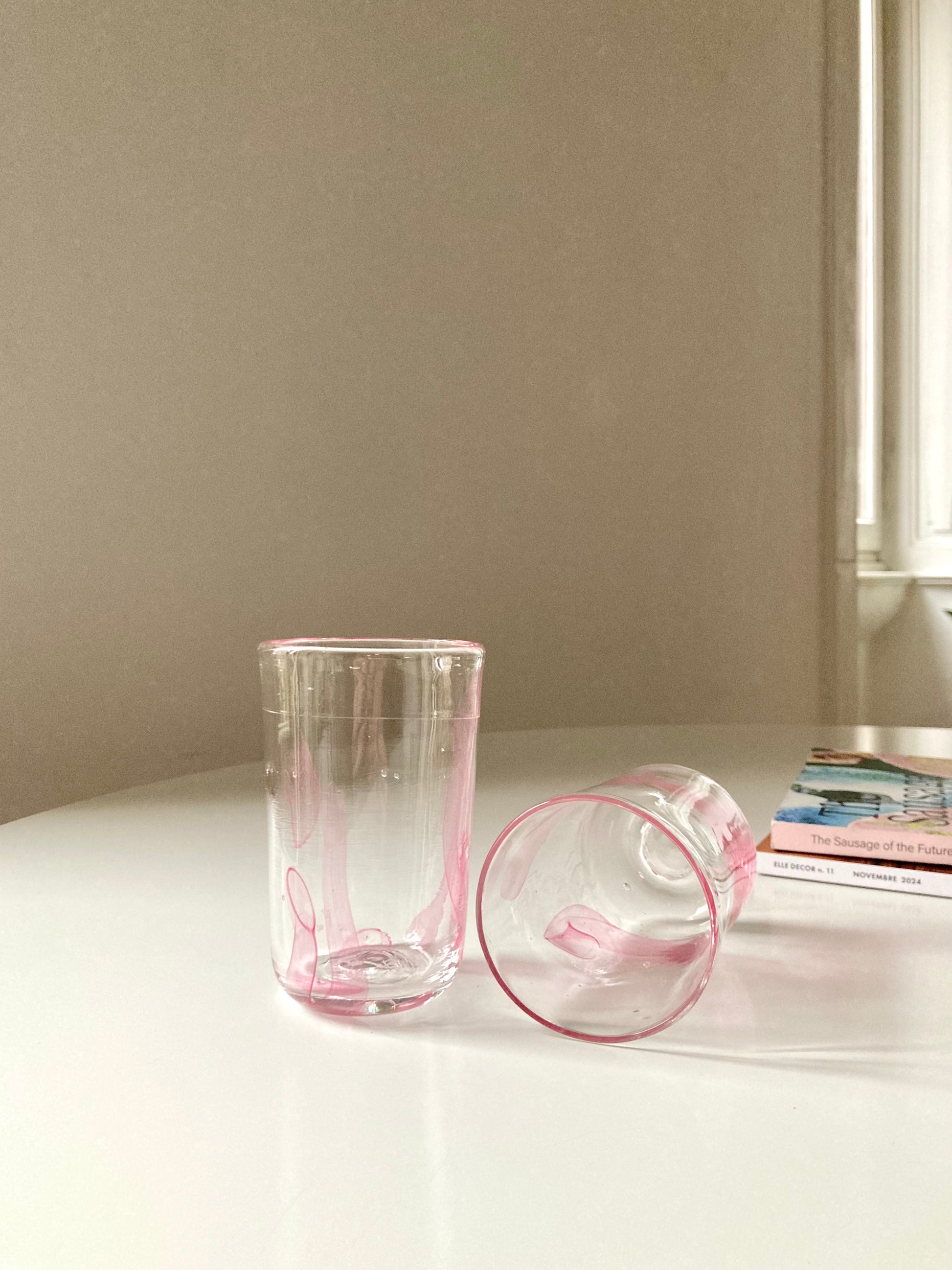 Set di bicchieri goti veneziani da vino o acqua realizzati interamente a mano in vetro di Murano trasparente e decorati con linee rosa che rendono ciascun bicchiere unico e diverso dagli altri 🎨