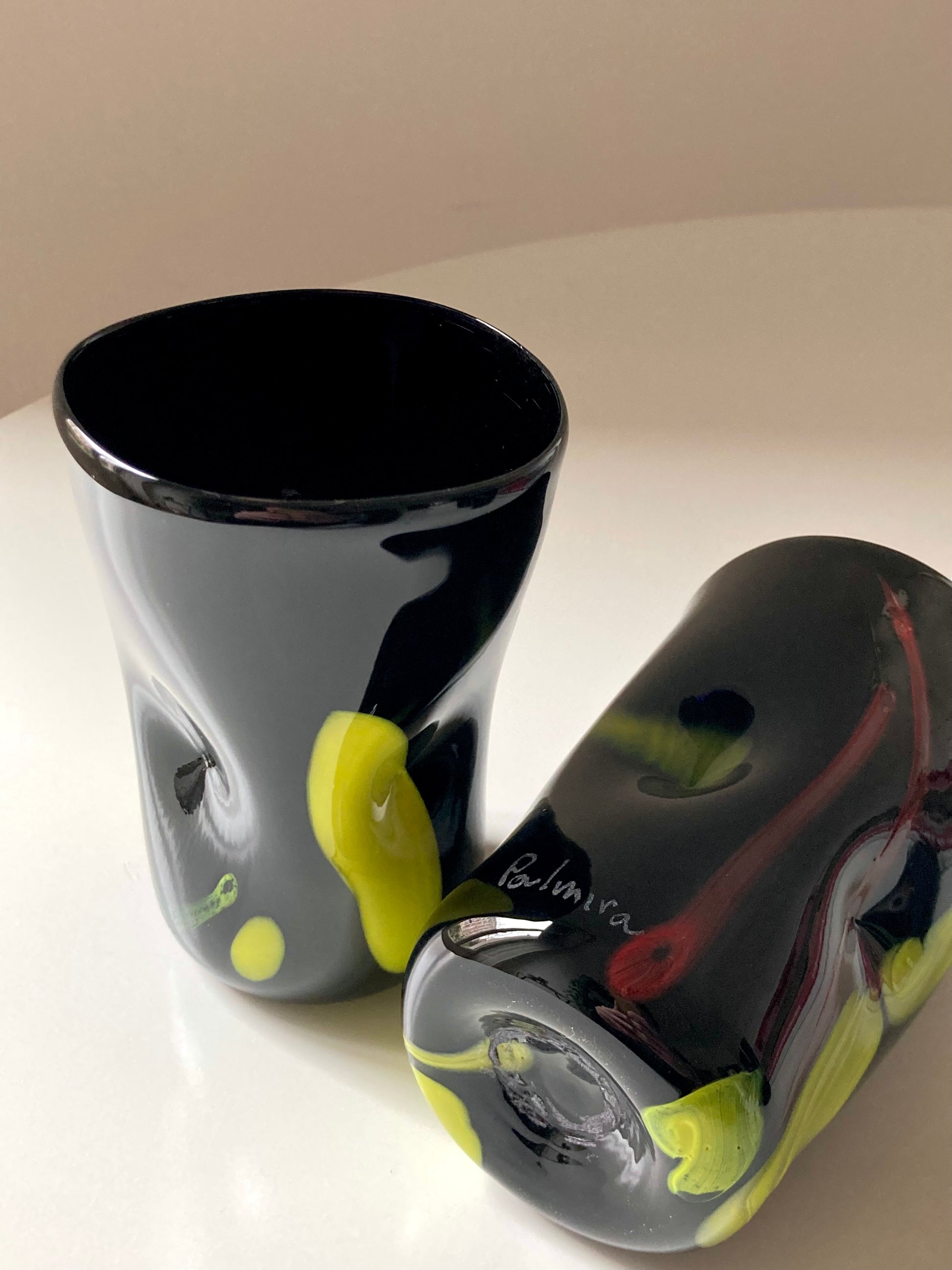 Set di bicchieri goti veneziani da vino o acqua realizzati interamente a mano in vetro di Murano nero e decorati con linee e forme astratte gialle e rosse che rendono ciascun bicchiere unico e diverso dagli altri 🖤💛