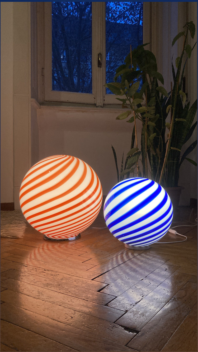 Lampe sphérique en verre de Murano fabriquée à la main, avec spirale bleue et base en métal émaillé blanc 💙🌀