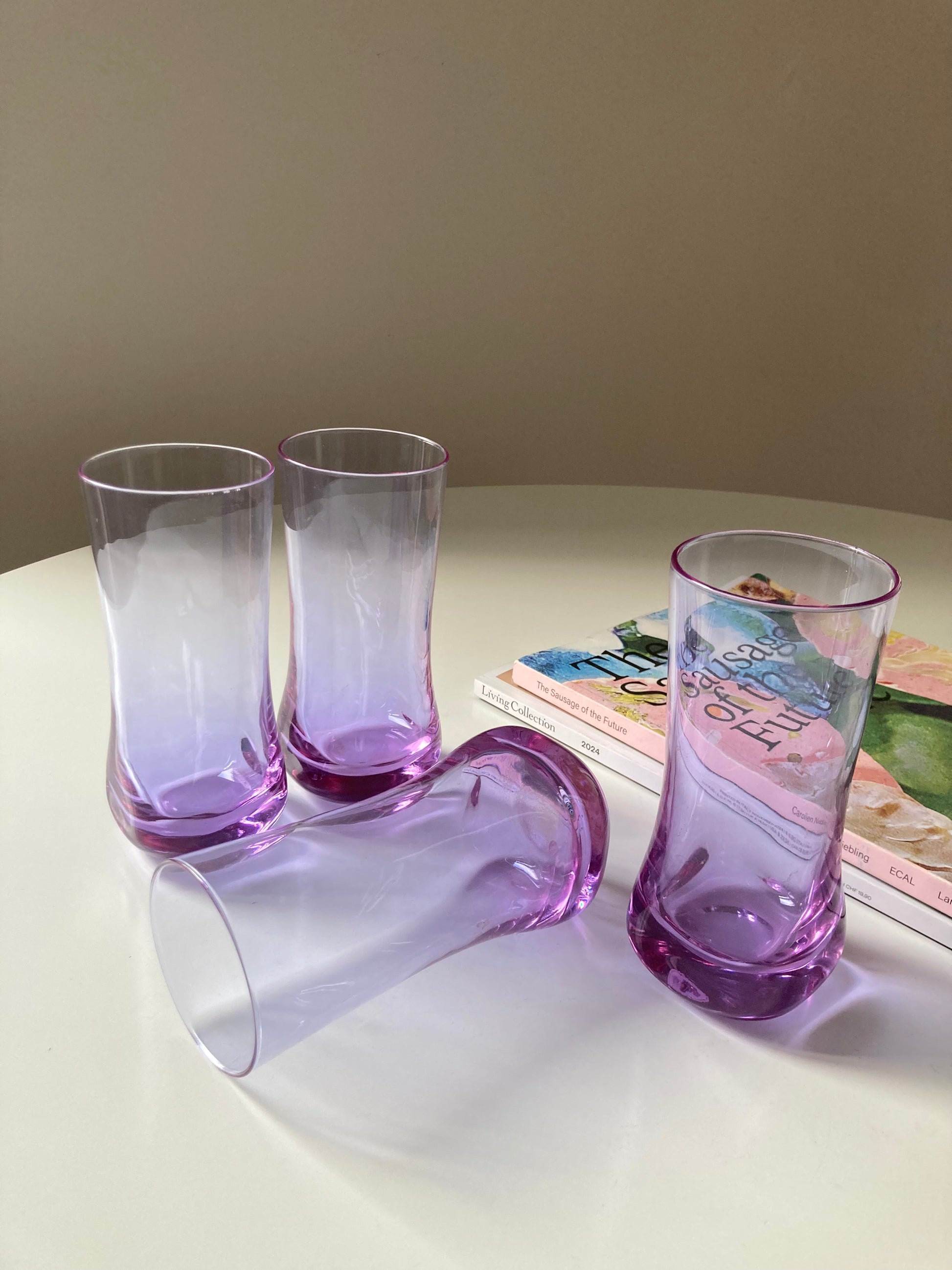 Ensemble de 4 grands verres en alexandrite violette qui devient bleue sous la lumière néon car, dans les années 70, on utilisait de l'oxyde de néodyme, un composé photosensible, pour colorer le verre 💜🩵