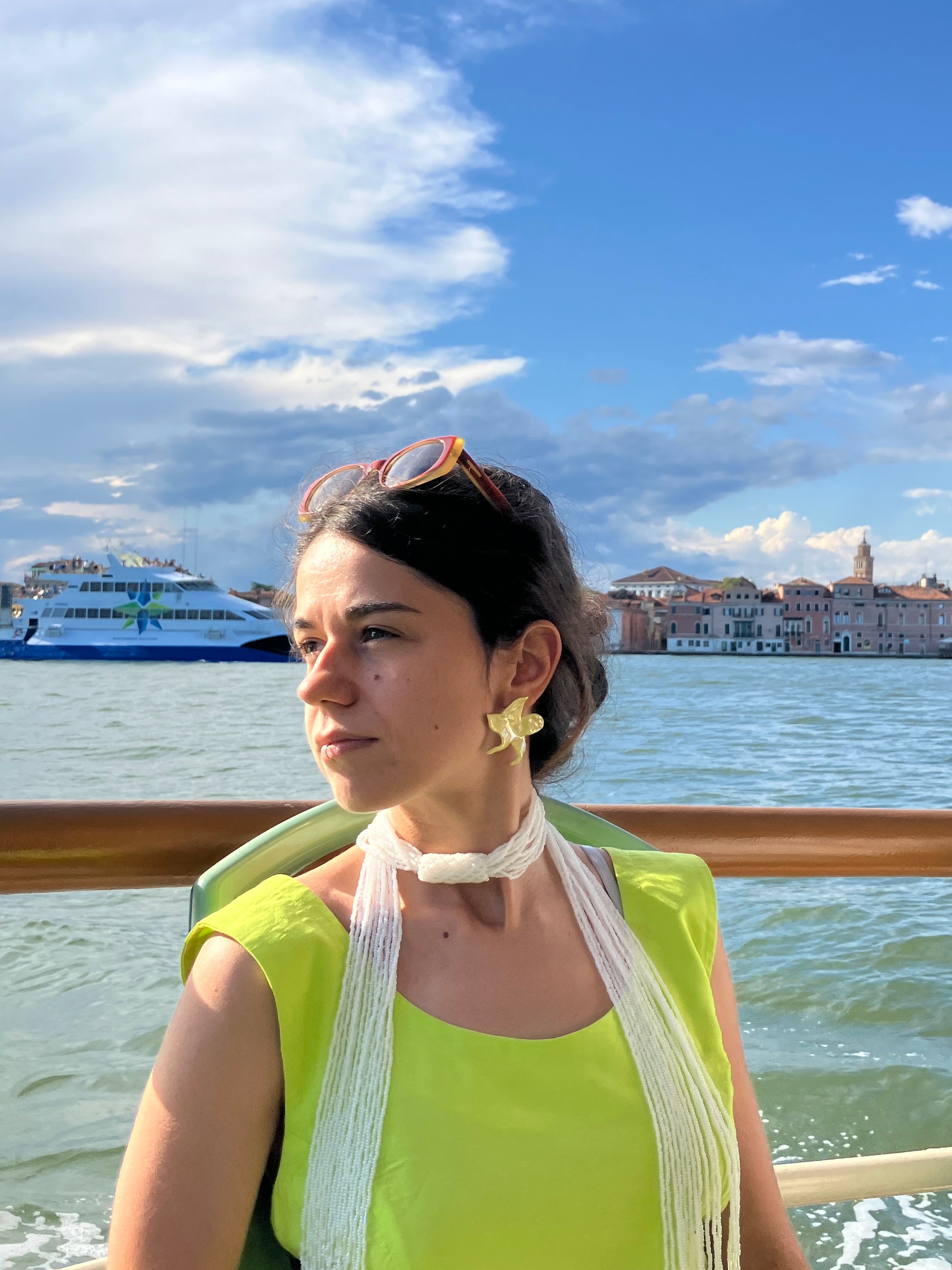 Collana di perline indossabile come uno scialle interamente realizzata a mano con conterie veneziane (piccole perline di vetro).