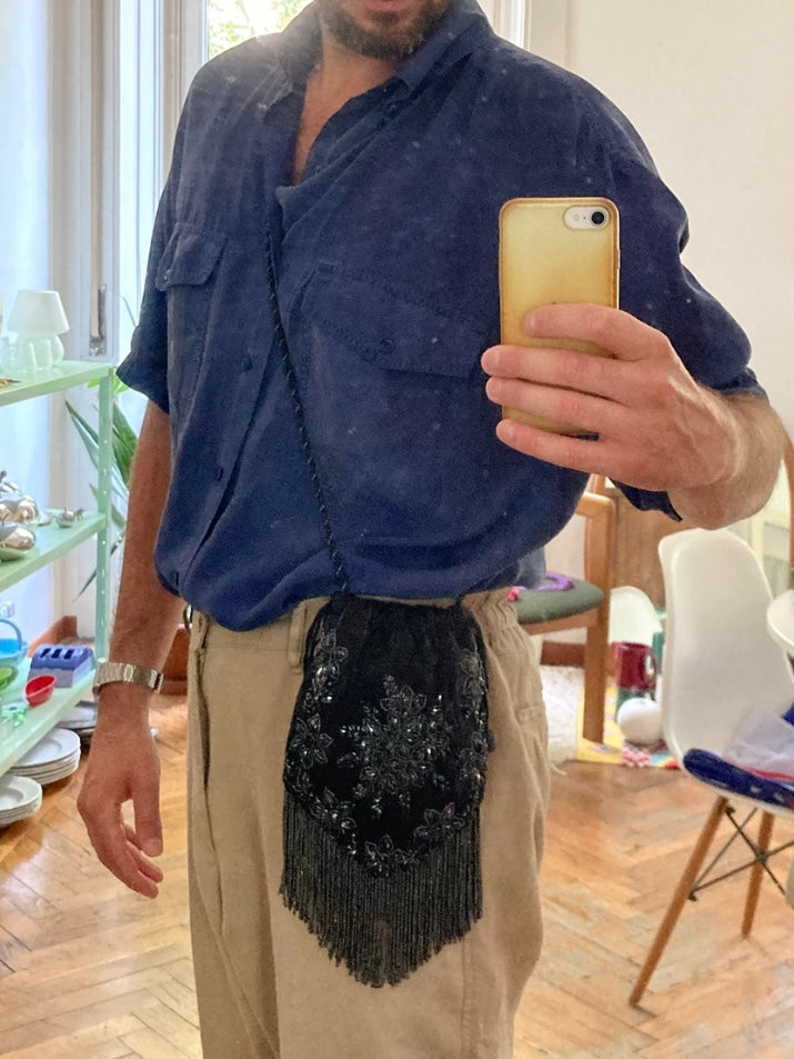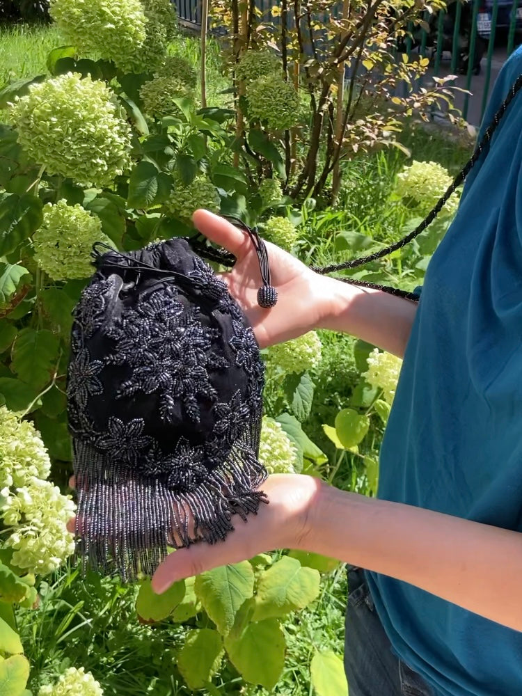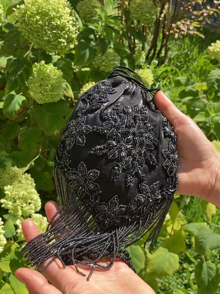 Pochette da sera in velluto nero fatta a mano con chiusura a coulisse e decorata con motivo floreale realizzato con conterie veneziane (piccole perline di vetro monocromatiche) 🌸🖤