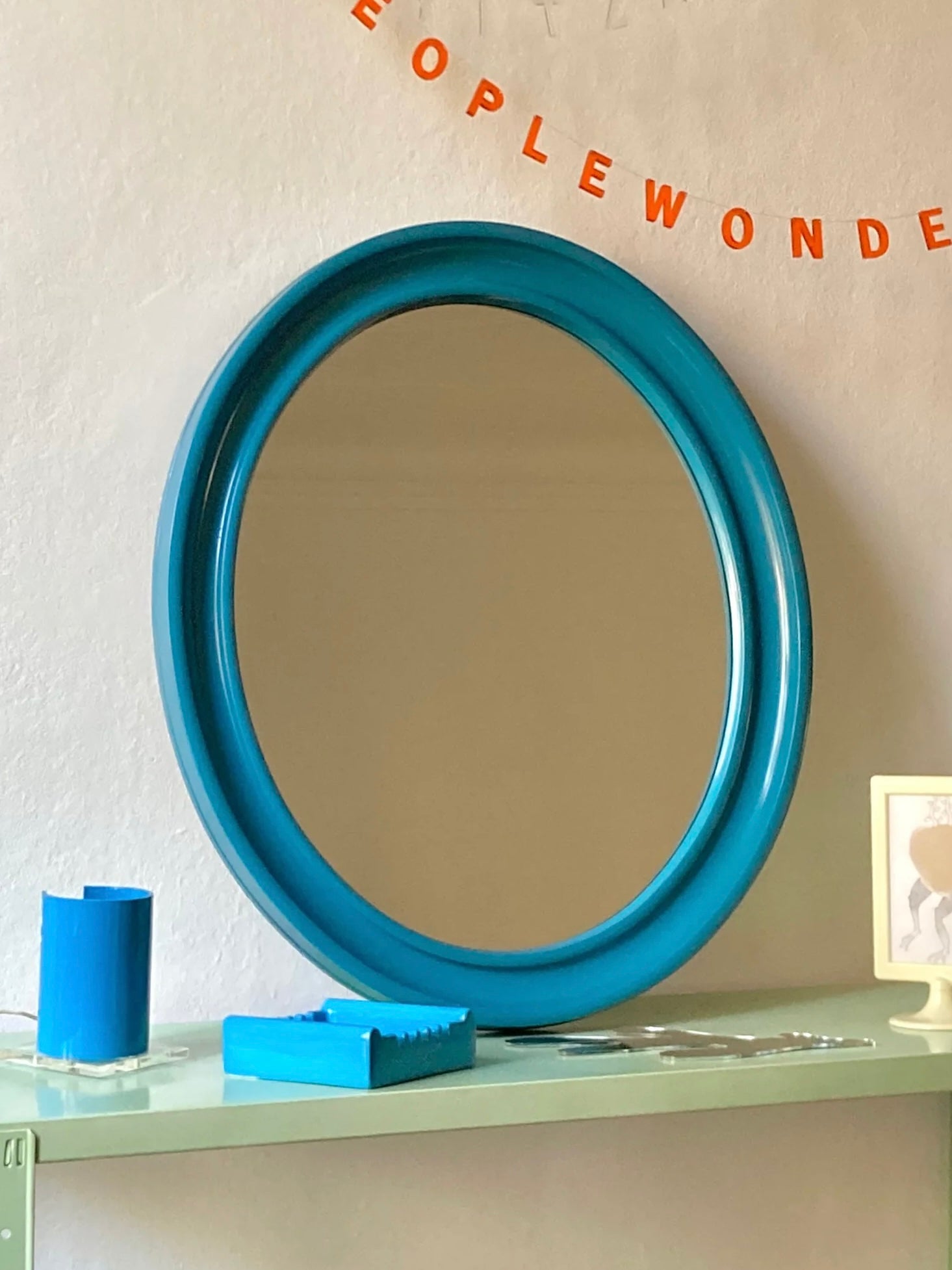 Grande specchio vintage Carrara & Matta modello America anni ‘70 ~ già popolare nella versione rotonda bianca o arancione, è più raro trovarlo nella forma ovale con cornice blu color del mare ⛵️🌊